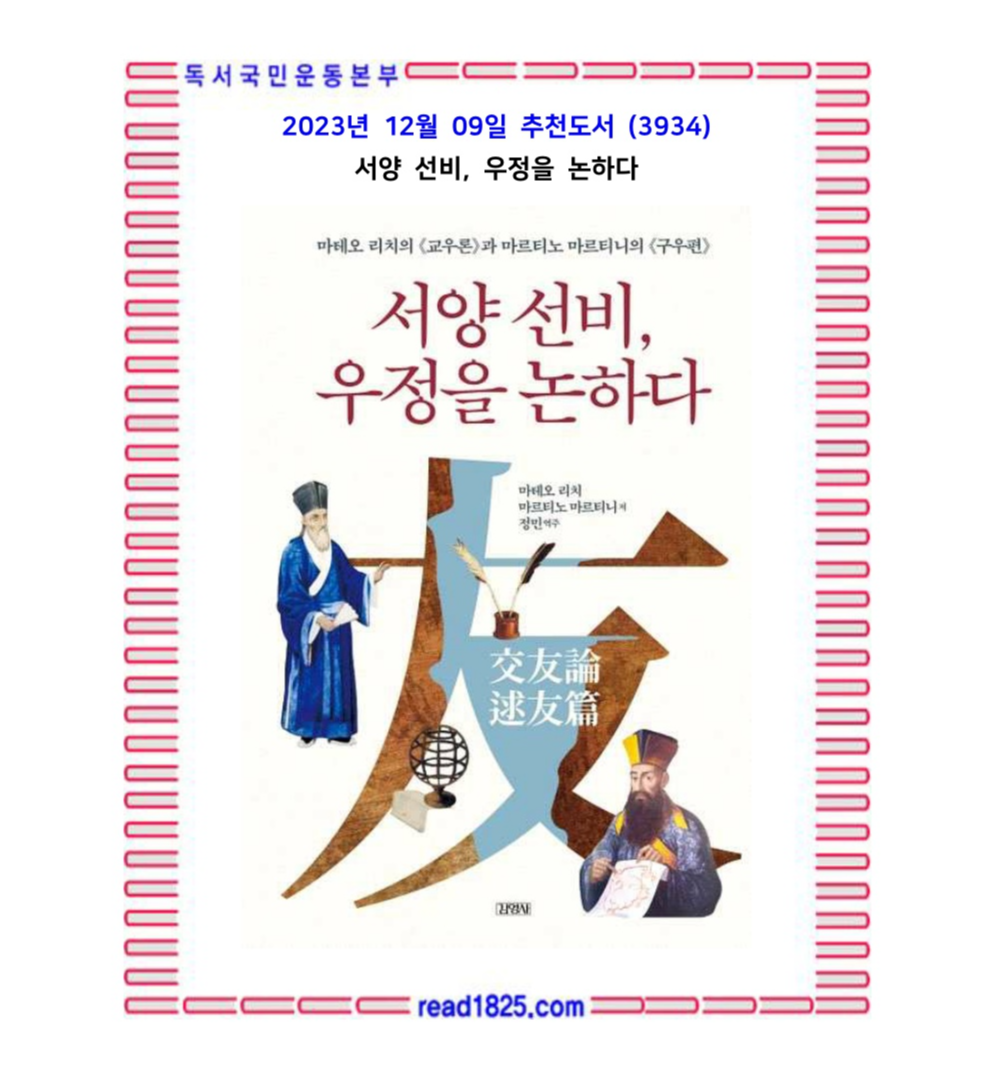 조선 지성사를 깊이 탐구해온 고전학자 정민 교수가 번역하고 해제를 붙인 마테오 리치의 《교우론》과 마르티노 마르티니의 《구우편》이 《서양 선비, 우정을 논하다》라는 제목으로 완역 출간되었다. 《교우론(交友論)》과 《구우편(逑友篇)》은 16~17세기 동서양 문물 교류의 선구였던 이탈리아 선교사 마테오 리치(Matteo Ricci)와 마르티노 마르티니(Martino Martini)가 옛 성현들이 예찬한 우정에 대하여 정리한 책이다.