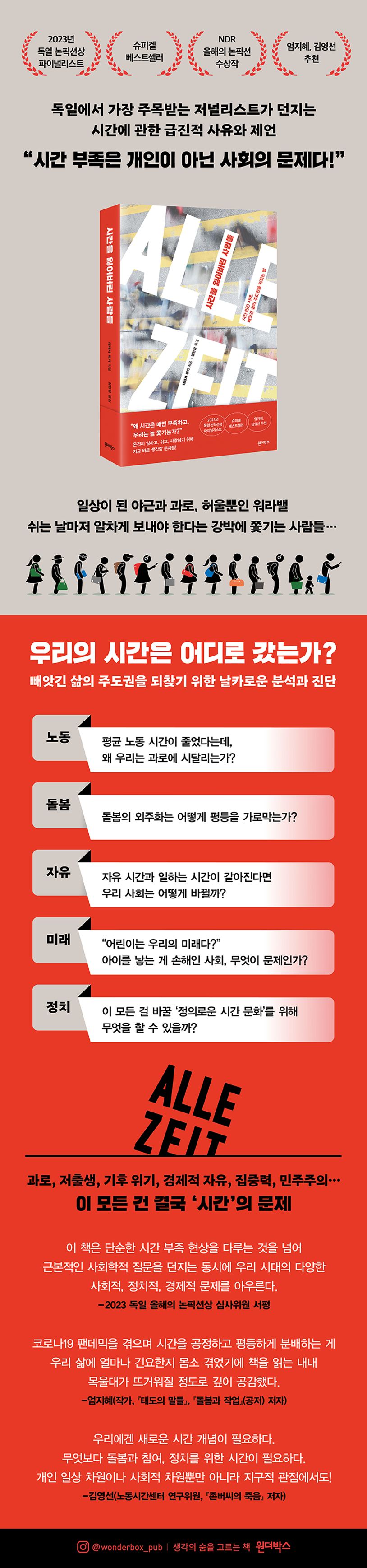 여기에서 시간의 가장 중요한 속성이 드러난다. 인간의 모든 활동은 ‘시간을 들이는’ 일이라는, 모두가 알고 있지만 단 한 번도 제대로 논의하지 않은 중요한 사실이다. 독일의 저널리스트 테레사 뷔커는 이러한 특성에 주목해 ‘시간’을 화두로 우리 사회에 긴요한 질문을 던진다. 기술은 발전하는데 왜 우리는 더 많이 일하는가? 부유한 사람은 가난한 사람에게 돌봄을 떠넘기고 여유를 얻는 한편, 가난한 사람은 시간 빈곤에 빠지는 건 정당한가? 가족과 함께하는 시간이 턱없이 부족한 현실에서 일과 가정의 양립은 가능한가? 대체 왜 시간은 늘 부족하고 우리는 늘 쫓기는가? 그녀의 물음과 분석, 그리고 제안은 노동, 돌봄, 자유, 미래, 정치 등 우리 삶의 토대를 근본적으로 뒤흔든다.