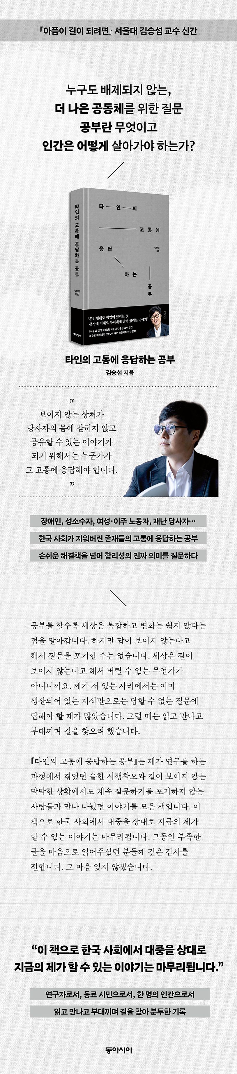 『타인의 고통에 응답하는 공부』는 김승섭이 ‘성실한 학자’로서 내놓은 또 하나의 무기이다. 책에서 그는 ‘예멘 난민 수용 논란’, ‘포괄적 차별금지법 제정’, ‘장애인 이동권 투쟁’ 등 한국 사회에서 가장 민감한 주제, 혹은 여론이 한쪽으로 기운 사건에 대해서도 신중하지만 단호하게 목소리를 낸다. 주제에 대한 엄밀한 태도, 원인의 원인을 파고드는 치열한 질문, 특유의 정갈한 문장은 한층 깊어졌다. 『아픔이 길이 되려면』을 통해 질병의 사회적 책임을, 『우리 몸이 세계라면』을 통해 생산되지 않는 지식에 대한 학계의 책임을 물었던 김승섭이, 이번 책에서는 ‘타인의 고통에 응답하는 공부’를 하는 사람으로서의 책임을 자기 자신에게 묻는다. 그 공부가 과연 우리와 무관하다고 말할 수 있을까?