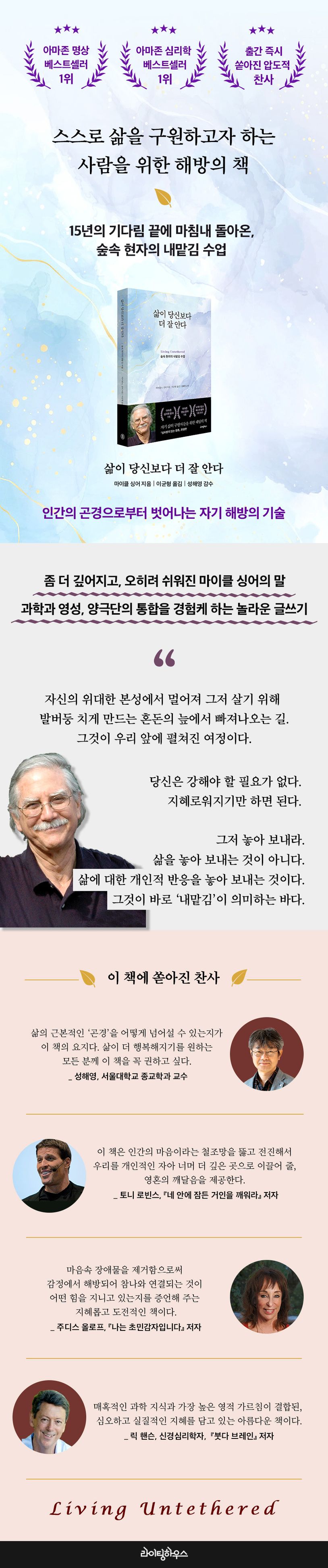 많은 독자들이 기다려 왔던 마이클 싱어의 최신작 『Living Untethered(2022)』가 영성 분야 전문 번역가 이균형 선생의 맛깔스러운 번역과 서울대학교 종교학과 성해영 교수의 믿음직한 감수가 더해져 『삶이 당신보다 더 잘 안다(2023, 라이팅하우스)』라는 제목으로 마침내 국내 출간되었다.