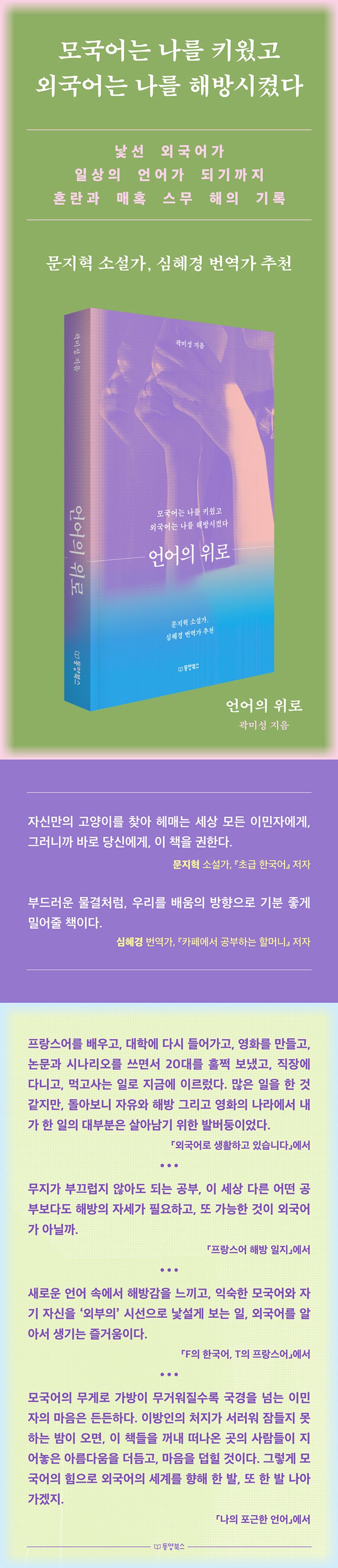그럼에도 지울 수 없는 결핍과 그리움은 모국어로 채운다. 출근 전 새벽마다 모국어로 글을 쓰고, “이미 몸과 마음속에 스며들어” 있어 “노력하지 않아도 자연스럽게 구사할 수 있는 단 하나의 언어”인 모국어로 쓰인 책들을 읽으며. 두 언어에서 받은 위로로 곽미성 작가는 꾸준히 자신만의 이야기를 만들어나갈 것이다. 다른 삶을 꿈꾸며 기꺼이 그 길을 걷고 있는 사람들에게 따뜻한 ‘언어의 위로’를 전하면서.