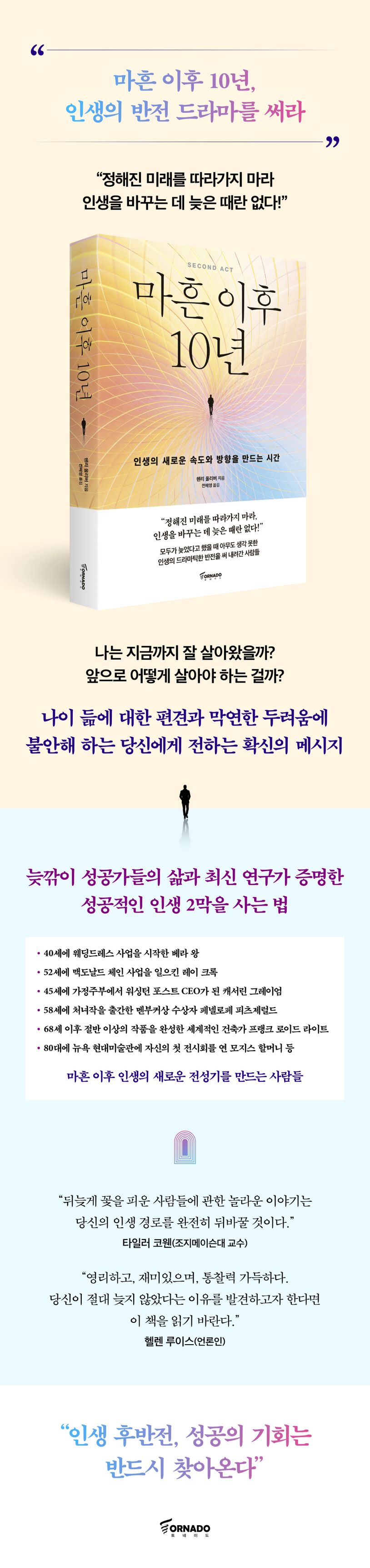 우리는 대부분 계획된 성공가도 위를 달리고 싶어한다. 그러나 인생의 절반쯤 왔을 때 삶이 우리의 생각대로 흘러가지 않는다는 사실과 함께 더 이상 변화의 기회가 오지 않을까 봐 낙심에 빠지곤 한다. 하지만 인생을 바꾸는 데 늦은 때란 없다. 이 책 『마흔 이후 10년』은 우리가 쉽게 내뱉는 ‘너무 늦었다’라는 말들에 반기를 들며, 마흔 이후부터 인생의 드라마틱한 반전을 써 내려간 사람들의 이야기로 당신을 안내한다.