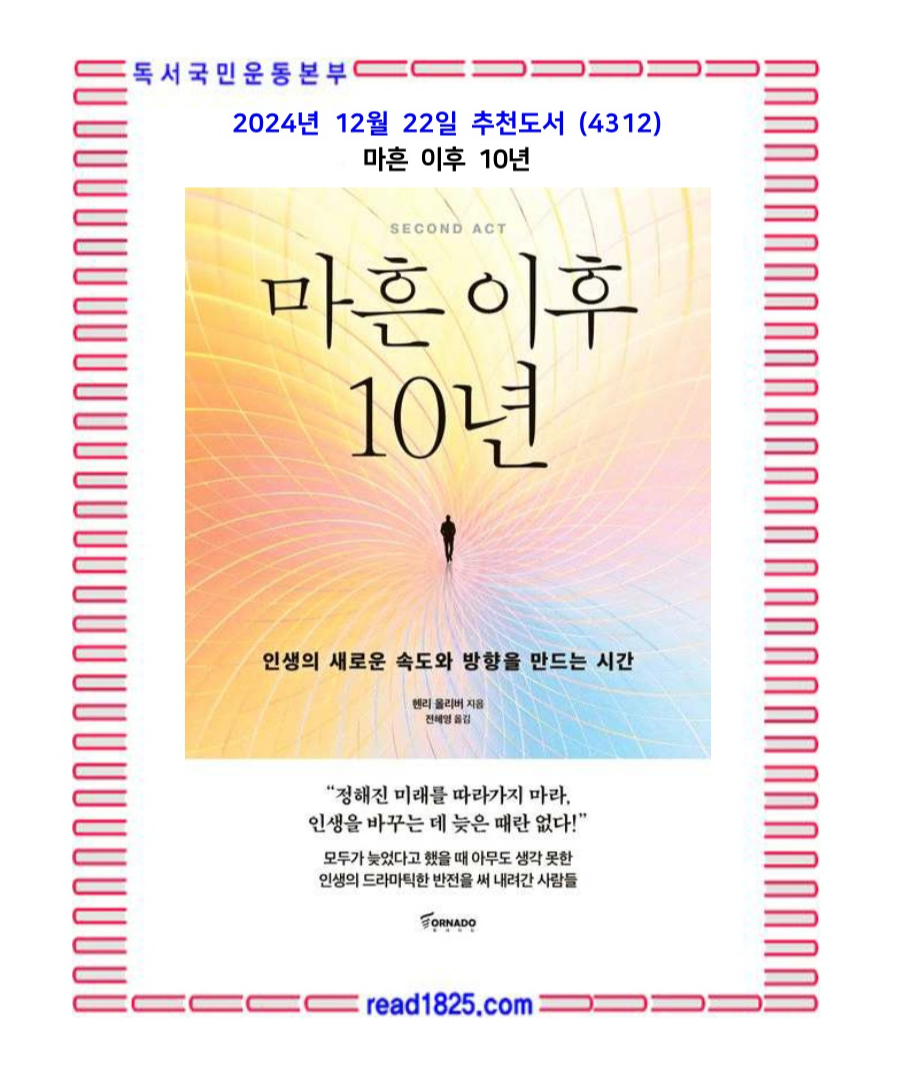 인생을 전반전과 후반전으로 나눈다면, ‘마흔 이후 10년’은 그 분기점이 될 것이다. 이 책은 삶의 전환기를 지나는 사람들에게 우리가 지나온 전반전은 후반전의 서막에 불과하다고 강조하며, 앞으로 당신이 인생을 어떻게 바라보느냐에 따라 무엇이든 해낼 수 있다는 메시지와 함께 어떻게 하면 인생의 새로운 황금기로 나아갈 수 있는지 그 경로를 분명하게 보여준다.