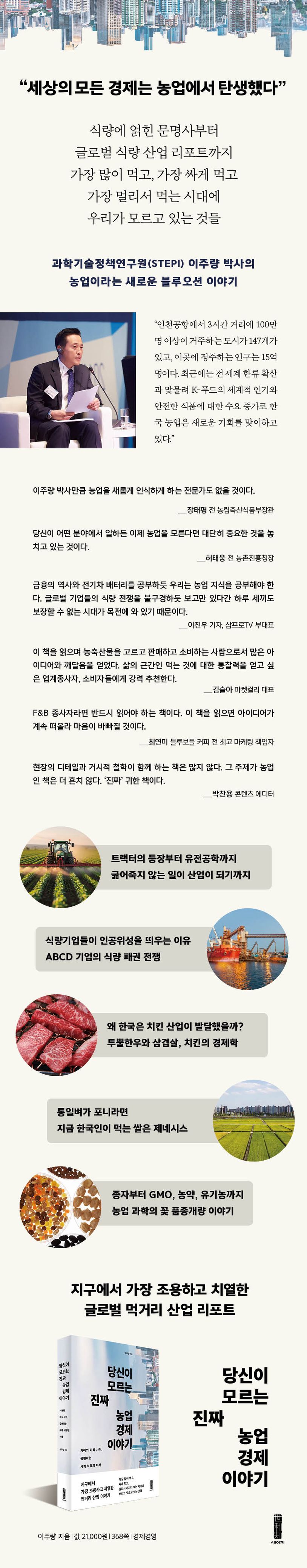 과학기술정책연구원(STEPI) 선임연구위원이자 농업전문가인 이주량 박사는 『당신이 모르는 진짜 농업 경제 이야기』에서 농업이라는 인류 생존 인프라 산업에 대한 문명사부터 현재 치열하게 격돌 중인 글로벌 식량 산업에 대한 숨가쁜 리포트까지 우리가 반드시 알아야 하는 살아 있는 농업 이야기를 풀어낸다. 삼포식 농업부터 트랙터, 비료, 유전공학까지 굶주림의 공포와 맞서 싸운 인류의 도전과 응전의 역사, 세계 식량산업의 패권을 쥔 ABCD라는 공룡 기업 이야기, 선물거래의 탄생과 금융 발전 이야기, 식량을 둘러싼 열강들의 조용한 외교 전쟁, 한국 딸기의 달콤한 성공과 나아가야 할 방향, 투뿔한우와 치킨 산업의 이면, 우리가 모르는 통일벼 개발의 뒷이야기, 블루오션으로 떠오르는 글로벌 식량 산업 이야기 등 시대와 국경, 산업과 학문을 넘나들며 농업에 관한 거의 모든 이야기를 담은 이 책은 한국인이 갖고 있는 농업에 대한 편견과 선입견을 걷어낼 수 있도록 농업의 산업적 통찰과 학문적 시사점을 선물하며 우리가 농업이라는 산업에 관심을 가져야 할 이유와 새로운 가능성을 밝힌다.