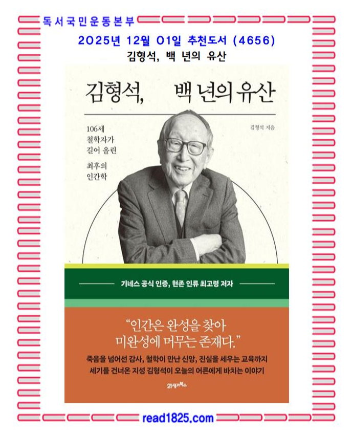 “사랑과 양심, 자유와 감사.” 그가 평생 붙들어온 이 단어들은 낡은 덕목이 아니라, 인간이 인간으로 남기 위한 최소한의 기준이다. 그는 죽음을 삶의 완성으로, 고독을 사유의 근원으로 읽어내며, 개인의 내면에서 시작해 사회와 공동체로 확장되는 인간의 길을 제시한다. 김형석은 이러한 백 년 사유의 결론을 추상적 이론으로 남기지 않고, ‘살아 있는 양심의 언어’로 되살린다. “감사를 잊지 말고, 끝까지 인간다움과 선을 지키라”는 김형석 교수의 묵직한 메시지는 궁극적으로 ‘사랑’이라는 가치를 개인과 공동체의 의무이자, 삶의 궁극적인 윤리로 확장한다. 『김형석, 백 년의 유산』은 사라져가는 이성의 시대에 남겨진 마지막 철학자의 목소리이자, 우리가 다시 인간으로 서기 위한 시대의 선언문이다.