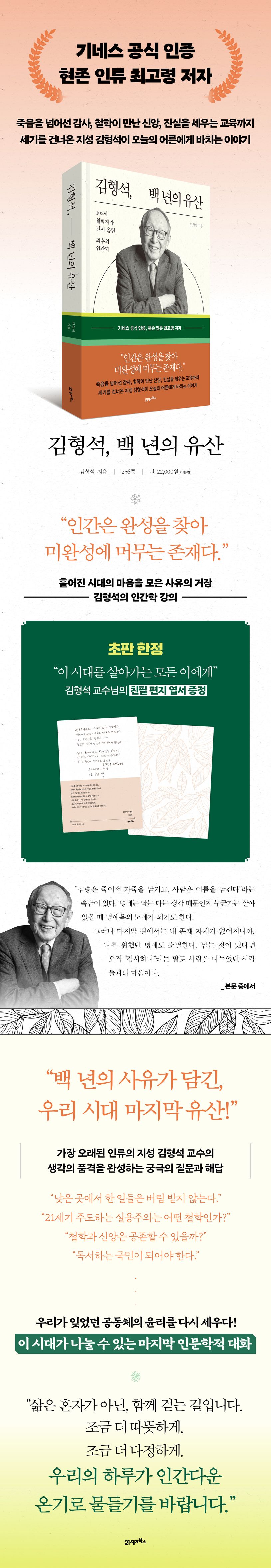 이 책에서 김형석 교수는 106년 삶의 경험을 토대로 한국의 역사적 순간들을 회고하며, 세월이 쌓아 올린 지혜와 통찰의 시각으로 현시대를 진단하고, 이 시대의 가장 큰 어른으로서 불안한 청년들의 미래를 따스히 위로하고 응원한다. 이처럼 과거, 현재, 미래를 아우르는 『김형석, 백 년의 유산』은 한 세기의 철학이 도달한 지혜의 완결판이다.