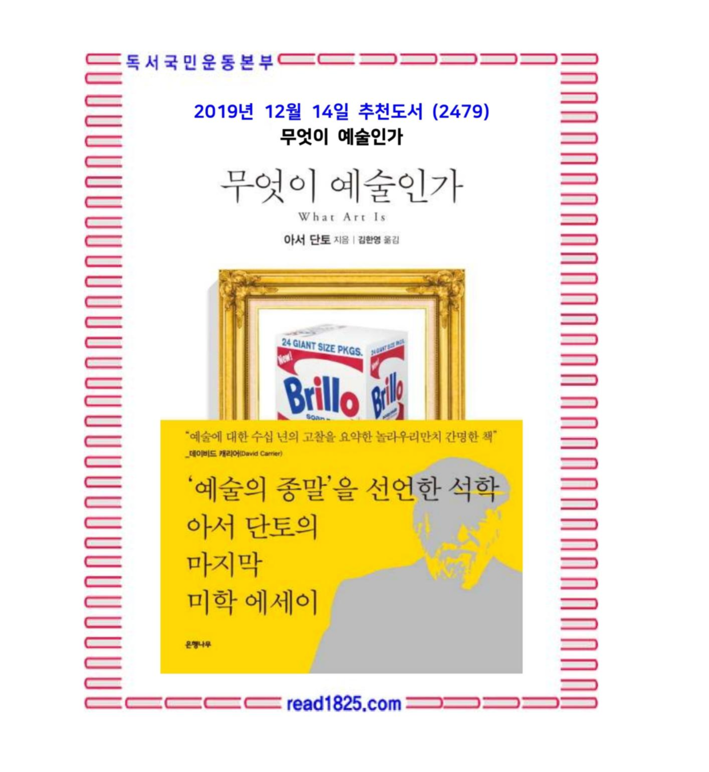 미국 팝 아트의 선구자 앤디 워홀의 오브제 《브릴로 상자》는 ‘브릴로’ 비누 세제를 운반하기 위한 상업용 포장 상자와 외관상 동일하나 예술작품으로 불린다. 예술작품을 결정하는 그 기준이 무엇이기에, 《브릴로 상자》는 예술이 될 수 있었을까? 2013년에 타계한 세계적인 예술철학자이자 평론가인 아서 단토의 미학은 바로 이러한 물음에서 시작되었다.