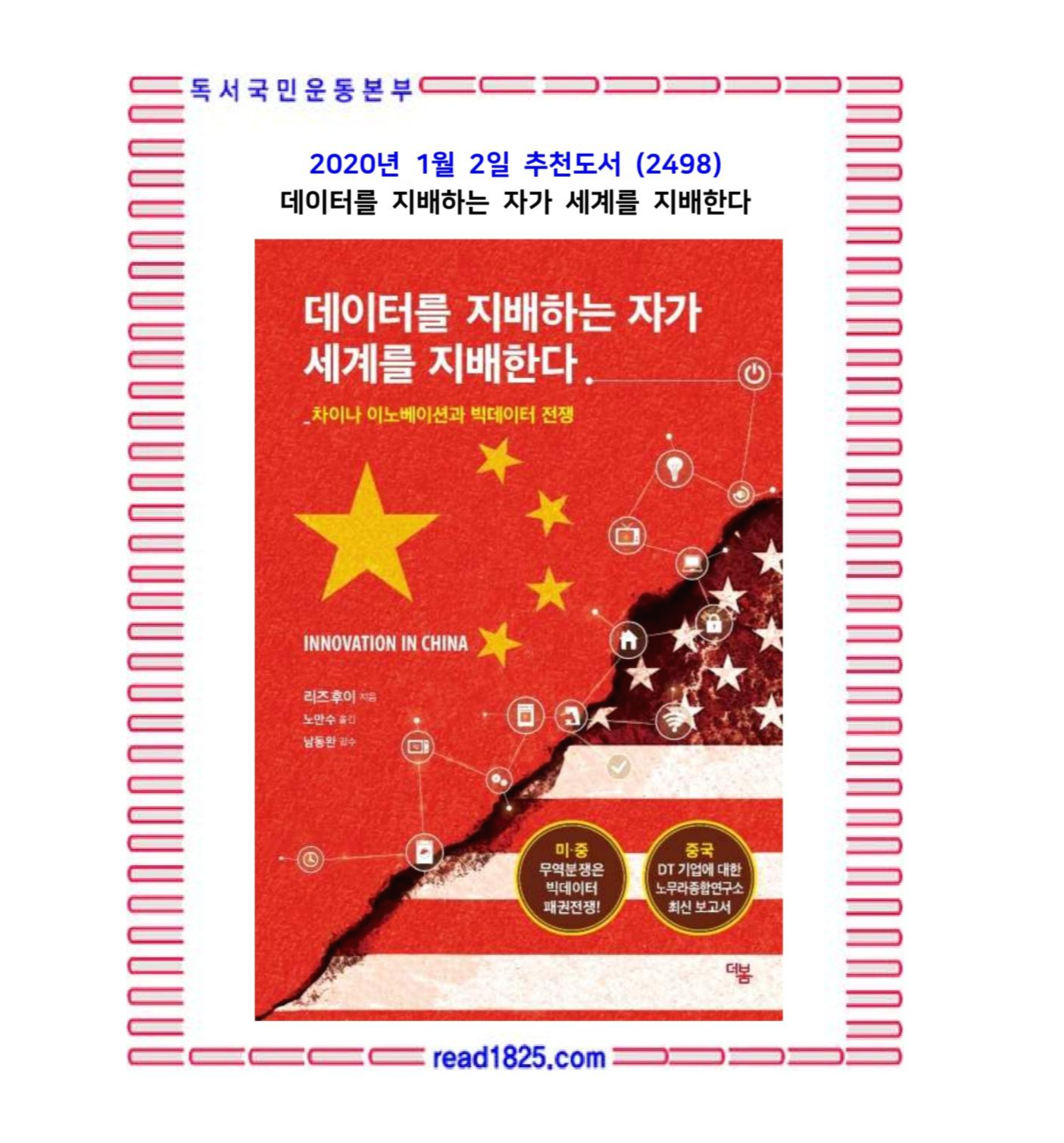 이 책은 일본 최고의 경제연구소인 노무라종합연구소에서 근무하는 중국 핀테크 연구의 1인자가 알리바바, 텐센트를 중심으로 중국발 4차 산업혁명의 실체와 최근 상황을 집중적으로 연구한 내용을 소개하고 있다. 저자는 중국의 데이터 비즈니스는 세계 경제패권을 노리는 중국 정부 전략의 연장선상에 있다고 주장한다. 중국의 IT·DT 업계의 기술 수준과 비전을 알고 싶다면, 빅데이터 패권을 둘러싼 미·중 무역전쟁의 배경이 궁금하다면 꼭 읽어보시길!