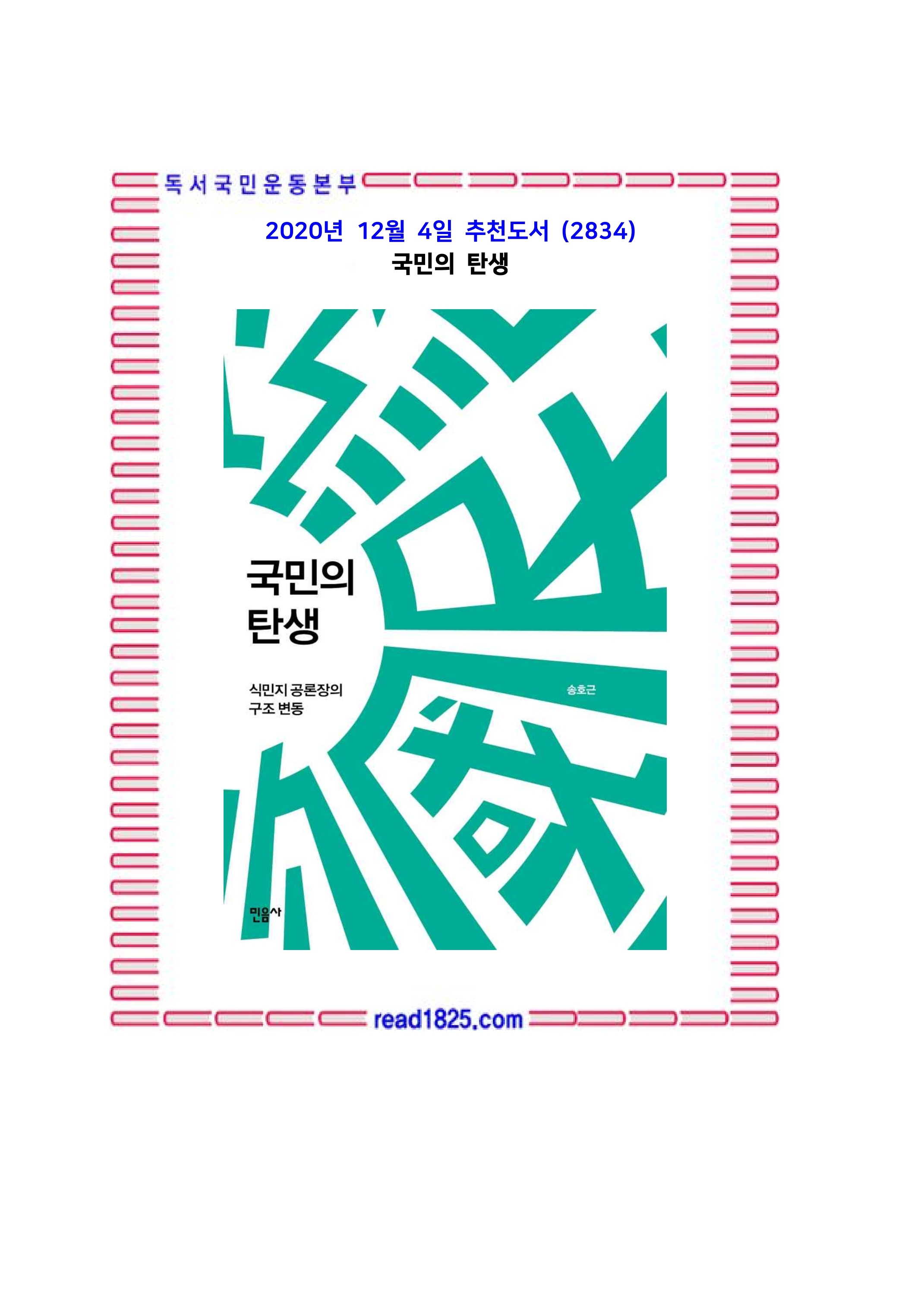 일본 제국주의는 광기를 띤 야만적 일탈의 시기였다. 이로 인해 조선의 근대는 갑작스럽게 차단될 위기에 처하고 개인과 사회는 동굴 속에 갇혔다. 그 암흑 공간에서 ‘국민의 탄생’을 알리는 신호음은 잘 들리지 않았다. 흔적은 도처에 산재했으나 그것을 일관된 논리나 경로로 해석하기 어려웠다. 왜 국민인가? 국민이 아니고는 일제 통치로부터 벗어난 독립 국가를 말할 수 없으므로 국민의 존재는 필수적이다. 그런데 시민 사회에 어떤 정치적 목적과 비전이 만들어져 타 국과의 경쟁 주체로서 정치적 공동체가 형성되어야 국민 국가로 가는 길이 열린다.