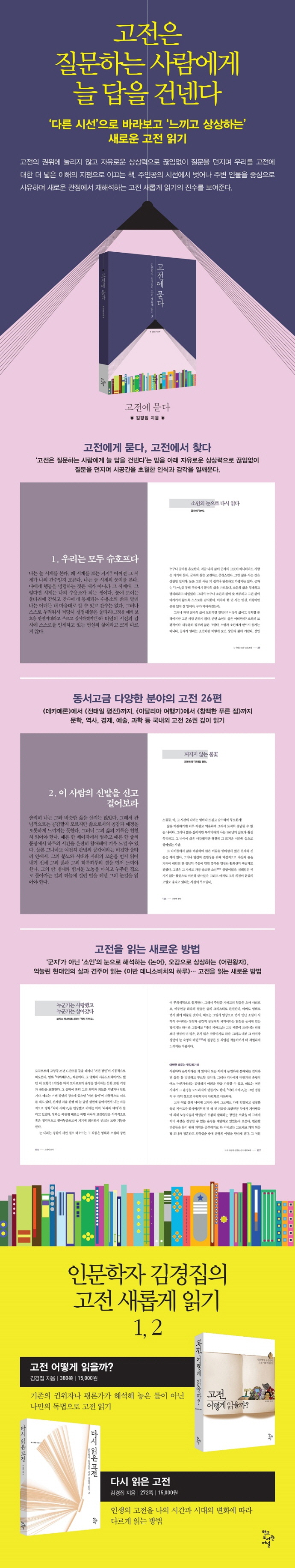 《고전에 묻다》는 인문학자 김경집이 출판전문지 《기획회의》에 연재했던 ‘고전 새롭게 읽기’ 시리즈의 셋째 권이다. 첫 번째 책 《고전, 어떻게 읽을까?》에서 익숙한 고전들을 새롭게 비틀어보는 방식을 시도했고, 두 번째 책 《다시 읽은 고전》에서 예전에 읽었을 때와 나이 든 뒤 읽었을 때의 생각과 느낌을 비교하는 방식을 실험했다면, 이번 완결편에서는 좀 더 다면적이고 심층적인 고전 독서법을 제안한다.
