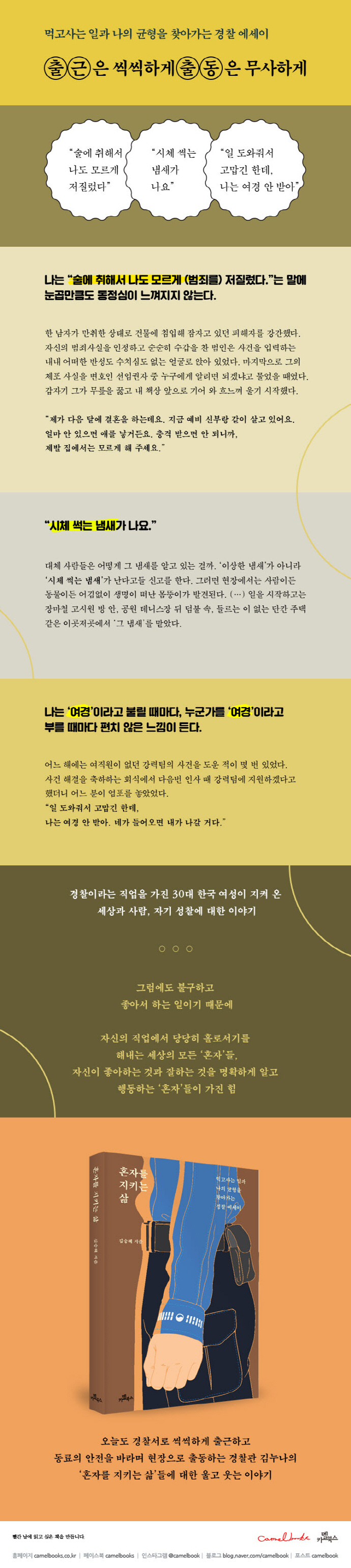 혼자를 기르고 혼자를 지키는 삶들이 있다. 혼밥, 혼술, 혼행이 별난 일이 아닌 시대지만 한국사회에서 ‘혼자’를 지키는 일에는 상당한 용기가 필요하다. 이 책은 경찰이라는 직업을 가진 30대 한국 여성이 지켜 온 세상과 사람, 자기 성찰에 대한 이야기를 담고 있다. 들큼한 시체 썩는 냄새를 맡으며 사건을 추적하거나, 취객이 쏟아 놓은 토사물을 치우는가 하면, 경찰 조직에서 바뀌어야 할 것 중에서 컨테이너 박스 사무실과 여경이라는 호칭을 꼽기도 하는 등 몇 줄짜리 신문기사로는 알 수 없었던 각각의 사연과 나름의 이유와 저만의 방식이 있다. 경찰서로 씩씩하게 출근하고, 오늘도 아무 탈 없이 무사하길 바라며 현장으로 출동하는 마음들을 위한 경찰관 김승혜(김누나)의 다정한 메시지를 읽다 보면 누군가는 삶에 대한 희망을, 누군가는 잘못된 사회 인식에 대한 분노를, 누군가는 타인에 대한 이해를 갖게 될 것이다.