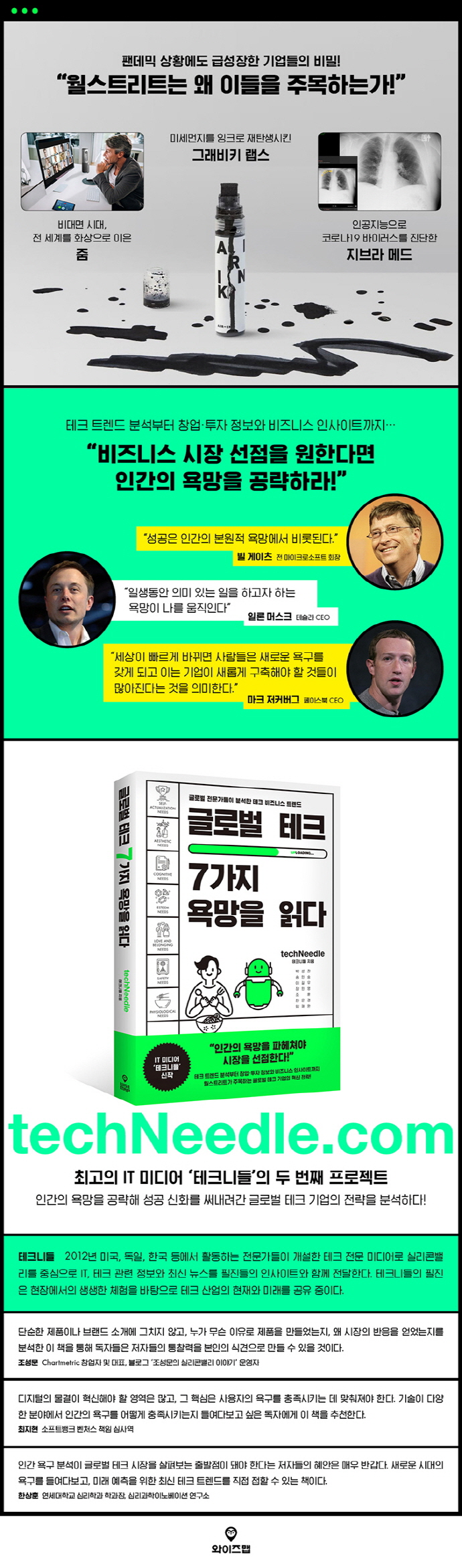 〈테크니들〉은 미국, 독일 등 다양한 지역에서 활동 중인 전문가들의 채널로, 현업에서 접하는 다양한 정보와 그들만의 창의적인 인사이트를 공유하는 작업을 이어오고 있다. 《글로벌 테크, 7가지 욕망을 읽다》는 전작 《인공지능 비즈니스 트렌드》의 뒤를 이어 테크 비즈니스에 대한 색다른 관점을 제시한 두 번째 프로젝트이다. 저자들은 인공지능, 가상현실, 양자 기술, 사물인터넷 등 혁신적인 기술력이나 속도만으로는 성공할 수 없다고 강조한다. 무한 경쟁의 시대에서 시장을 선점할 유일한 열쇠는 인간의 본질적인 ‘욕구’를 제대로 겨냥하는지의 여부라고 단호히 제시하고 있다. 인간의 강력한 욕구를 충족시킨 다양한 기업 사례를 분석한 저자들은 ‘매슬로의 욕구 7단계’를 바탕으로 그들만의 성공 포인트와 전략을 세밀하게 알려준다. 이 책은 단순히 트렌드를 짚어내는 것을 넘어 시장을 주도하는 테크 키워드와 창업·투자 정보, 비즈니스 인사이트까지 한 권에 담아낸 결과이다