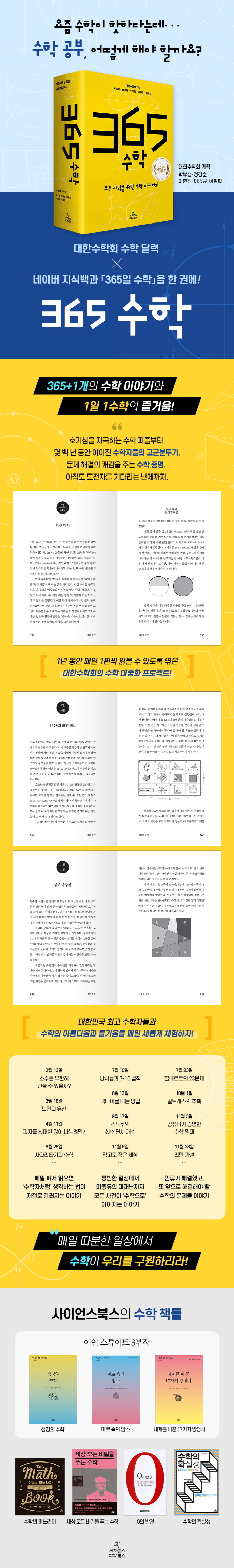 수학 공부를 잘하고 싶은 학생부터, 일찍이 한번 포기했던 수학을 다시 접하며 삶에 자극을 받으려 하는 성인까지, 『365 수학』과 함께 1일 1수학하다 보면 어느새 수학에 재미가 붙어 가는 자신을 발견할 수 있을 것이다.