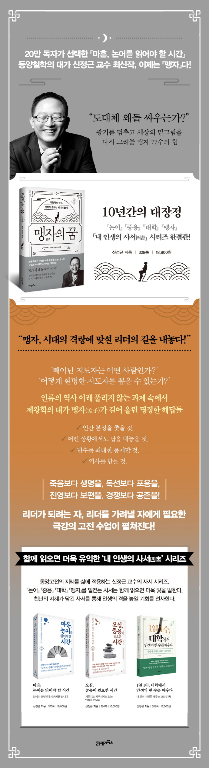 2011년 『논어』 편을 시작으로 2019년 『중용』과 2020년 『대학』을 거쳐 이번 『맹자』 편을 끝내면서 10년 만에 「내 인생의 사서(四書)」 시리즈를 마무리 짓게 된 저자는, 전공자가 아니더라도 동아시아 문화의 기반이자 시대의 초석인 ’사서‘를 허리끈을 풀어놓고 좀 느긋하게 맛볼 수 있길 기대하고 있다. 특히 이번에 맹자가 전하는 ’리더 수업‘은 흔들리지 않고 자신의 길을 뚜벅뚜벅 걸어가며 새로운 시대를 여는 초인의 리더십을 기대하는 현대사회에 생각의 지평을 넓혀줄 지혜와 통찰을 선사할 것이다.