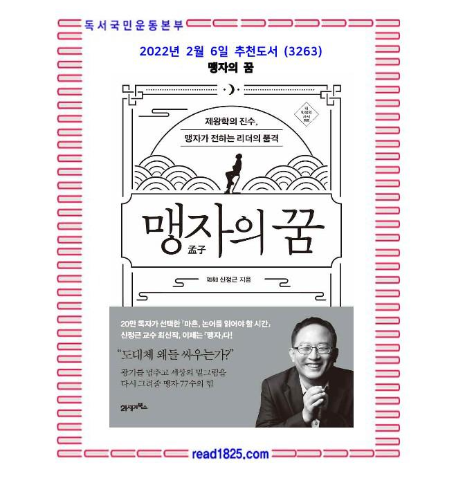 『맹자의 꿈』은 『마흔, 논어를 읽어야 할 시간』, 『오십, 중용이 필요한 시간』, 『1일 1수, 대학에서 인생의 한 수를 배우다』에 이은 「내 인생의 사서(四書)」 시리즈 완결판으로서, 흔들리지 않고 자신의 길을 뚜벅뚜벅 걸어가며 새로운 시대를 여는 초인의 리더십을 기대하는 현대사회에 생각의 지평을 넓혀줄 지혜와 통찰을 선사할 것이다.