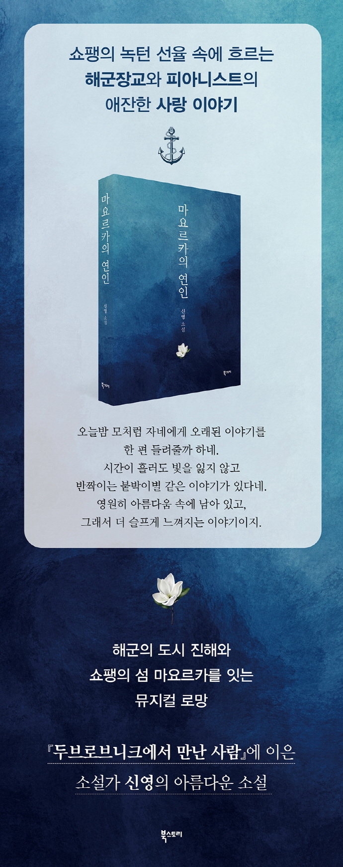 여기에 OCS 출신인 김석철 화백의 서정적인 삽화가 소설의 감동을 배가시킨다. 진해역, 흑백다방, 초계구축함, 마요르카의 풍경 등 소설의 핵심을 포착해서 그대로 녹여낸 그림이 독자들을 소설 속 세계로 안내해줄 것이다. 『마요르카의 연인』은 『두브로브니크에서 만난 사람』에 이어 소설가 신영의 진가를 보여줄, 마요르카의 풍경처럼 아름다운 소설이다.