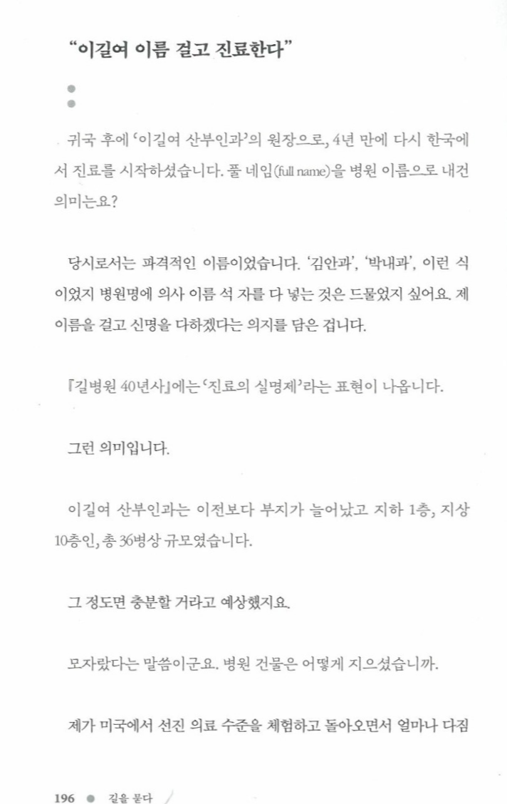 1958년 ‘이길여 산부인과’를 개원했고 1978년 국내 여의사로는 처음으로 의료법인을 설립했다. 의료보험제도가 없던 시절 ‘보증금 없는 병원’을 써 붙이는 등 병원 문턱을 낮추고 무의촌과 낙도를 대상으로 무료 진료에 앞장섰다. 의료 취약지인 백령도와 철원, 양평에서 적자를 감수하며 의료 수혜의 폭을 넓히는 데 헌신했으며, 그 공로를 인정받아 2003년 민간인으로서는 최고인 국민훈장 무궁화장을 받았다.