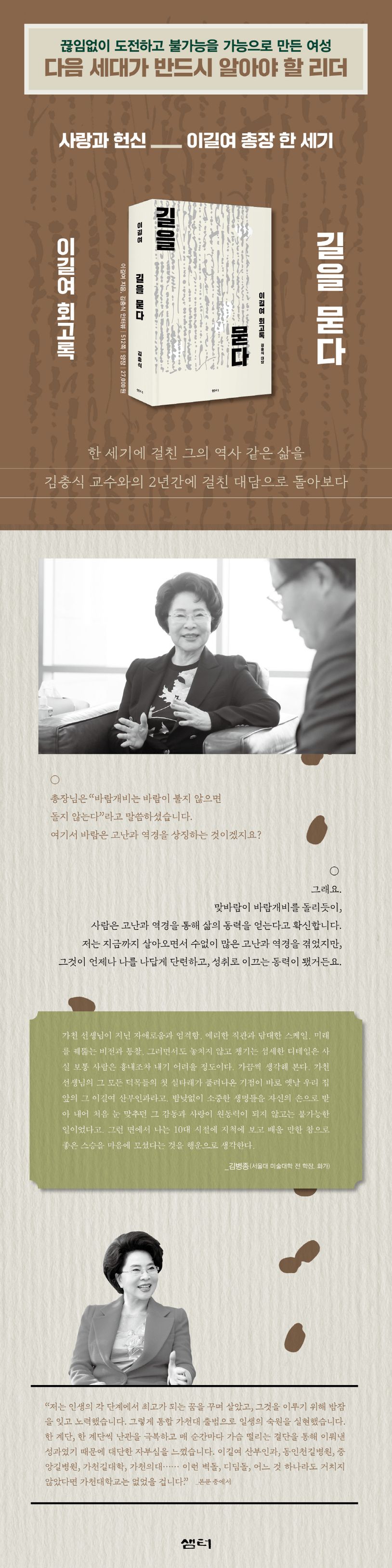 한국여자의사회 회장, UN 여성대회 정부 대표, 서울대 의대 동창회장, 의사협회 100주년 위원회 위원장 등을 역임했으며, 2022년 현재 가천대학교 총장으로 재직 중이며 가천의대 길병원, 가천문화재단, 가천박물관, 새생명찾아주기운동본부, 가천미추홀봉사단, 경인일보에 이르기까지, 의료ㆍ교육ㆍ문화ㆍ봉사ㆍ언론 분야를 아우르는 국내 최대의 공익재단인 ‘가천길재단’을 이끌고 있다.