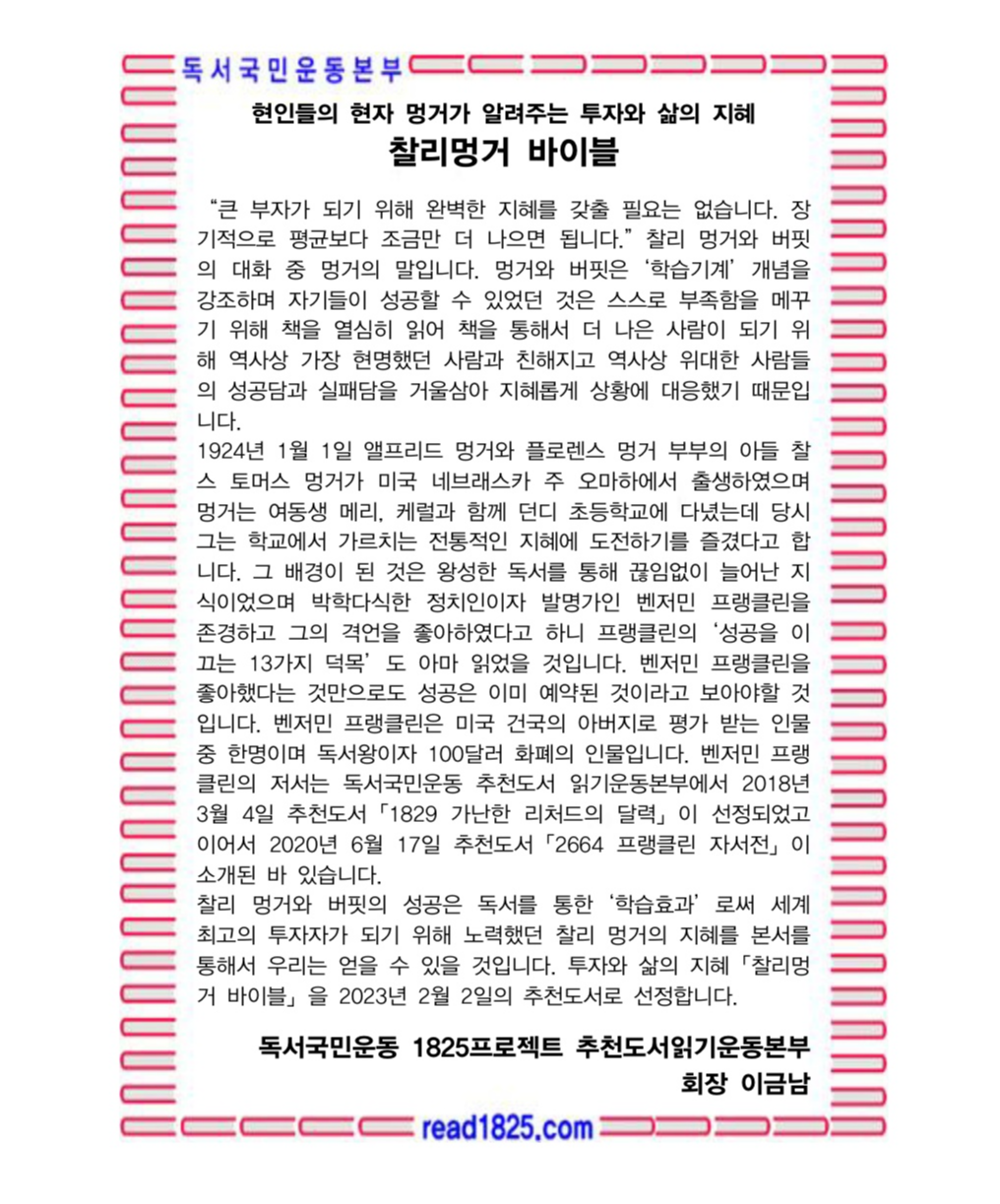 다음에 소개되는 찰리멍거의 투자원칙은 벤저민 프랭클린 자서전 「가난한 리처드의 달력」을 참고하면 더욱 효과적일 것입니다. ‘가난한 리처드의 달력’은 <Read 1825.com>에서 2018년 3월 4일 소개되어 있으며 요약내용을 지금 확인할 수 있습니다.