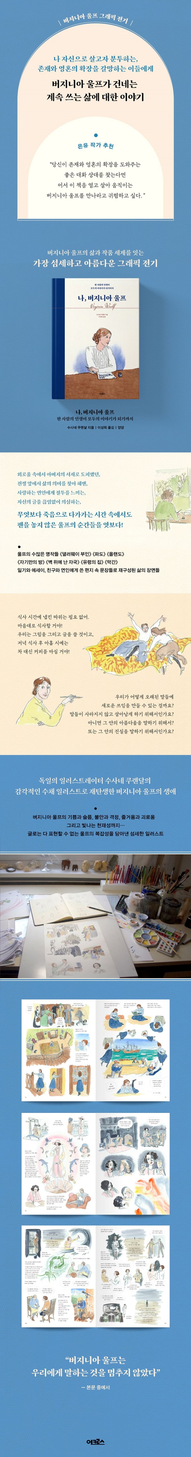 《나, 버지니아 울프》는 평생 정신적 어려움을 겪으면서도 날카로운 펜으로 남성 중심의 세계에 빛나는 발자취를 남긴 버지니아 울프의 삶을 아름다운 그림과 압축적인 글로 보여주는 그래픽 전기다. 작가 버지니아 울프가 걸어온 길뿐만 아니라 부모의 죽음에 죄책감을 느끼는 딸, 다른 작가의 책을 펴내며 재미를 느꼈던 출판인, 연인과 남편을 모두 사랑한 한 여성의 모습 역시 마주할 수 있다.