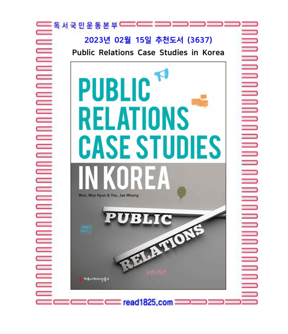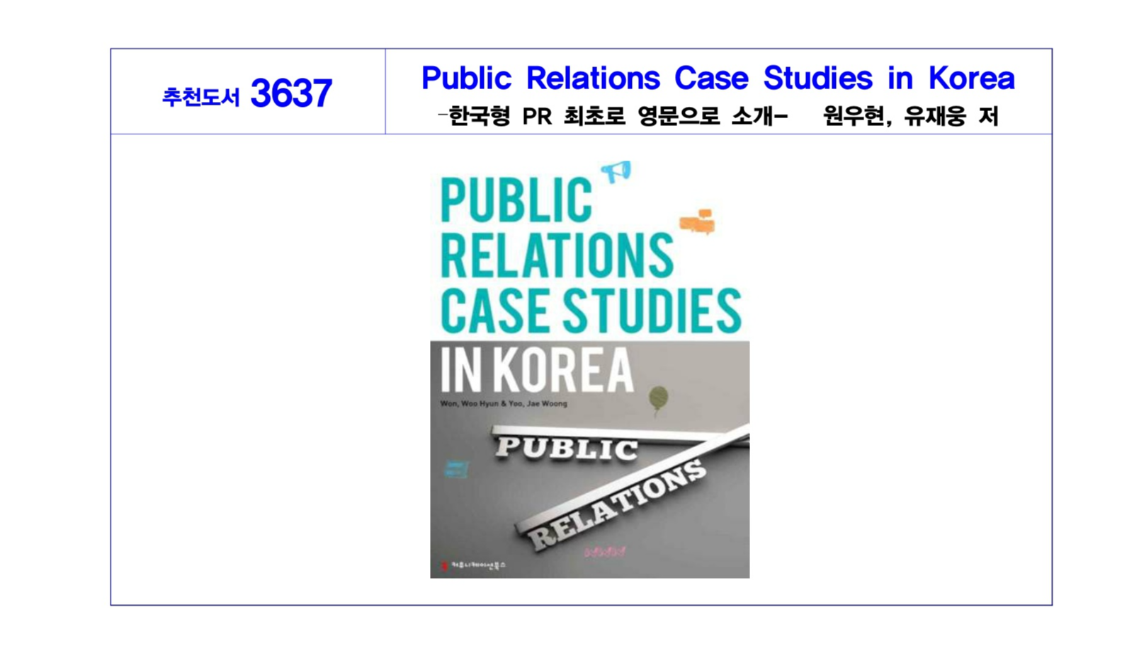 ≪한국에서의 PR 사례(Public Relations Case Studies in Korea)≫는 한국의 PR 현상을 영어로 설명한 책이다. 한국의 경제 규모가 세계 10위권으로 높아졌고 한국의 PR 학계와 업계 또한 단기간 내에 괄목할 한 성장을 거두었음에도 불구하고 국제 사회의 기대에 부응하는 외국어로 된 한국 PR 서적은 극히 미미한 실정이다. 이 책은 이러한 아쉬움을 달래주기에 부족함이 없을 것이다.
