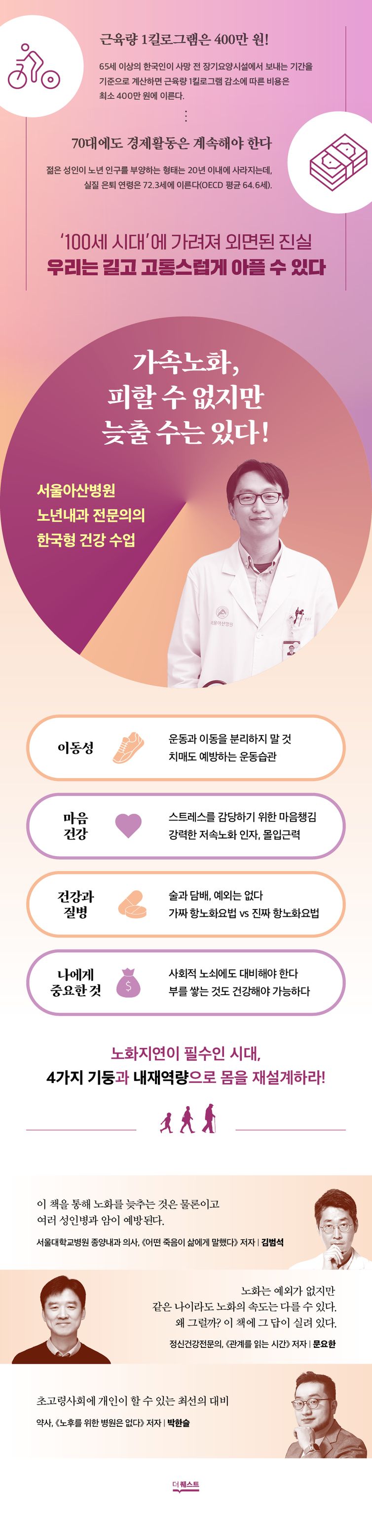 노화에 대해서 모두가 알고 있지만 외면하는 진실이 있다. 100세 시대가 도래했다고는 하지만, 과연 우리는 오래도록 ‘건강하게’ 살 수 있을까? 서울아산병원 노년내과 전문의이자 노화를 제대로 공부하기 위해 KAIST에서 의과학 박사학위를 취득한 노화생물학자 정희원 교수는 말한다. 지금 같은 생활습관이라면 평균수명은 늘어도 고통스러운 노년을 피하기 어렵다고. 이것은 단순히 병원 신세를 지는지 여부에 관한 문제가 아니다. 인구구조와 제도적인 특성상 경제활동에서 완전히 은퇴하는 것은 상상하기 어렵고 신체적으로 돌봄을 받는 것도 더욱 어려워질 이 한국사회에서 생존과 삶의 질이 달린 문제다.