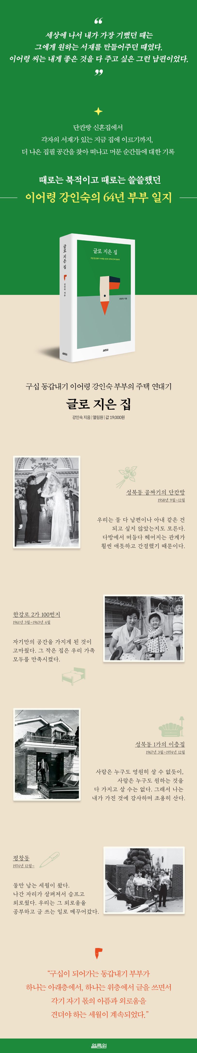 『글로 지은 집』은 빈손으로 시작해 원하는 서재를 갖춘 집을 갖기까지 이어령 강인숙 부부의 주택 연대기다. 신혼 단칸방부터 이어령 선생이 잠든 지금의 평창동 집에 이르기까지, 더 나은 집필 공간을 확보하기 위한 불가피한 투쟁의 역정이 담겼다. 1958년부터 현재까지 떠나고 머문 공간, 그리고 그 공간 안에서 함께 존재했던 부부의 삶이 강인숙 관장의 이야기 속에 고스란히 스며 있다.