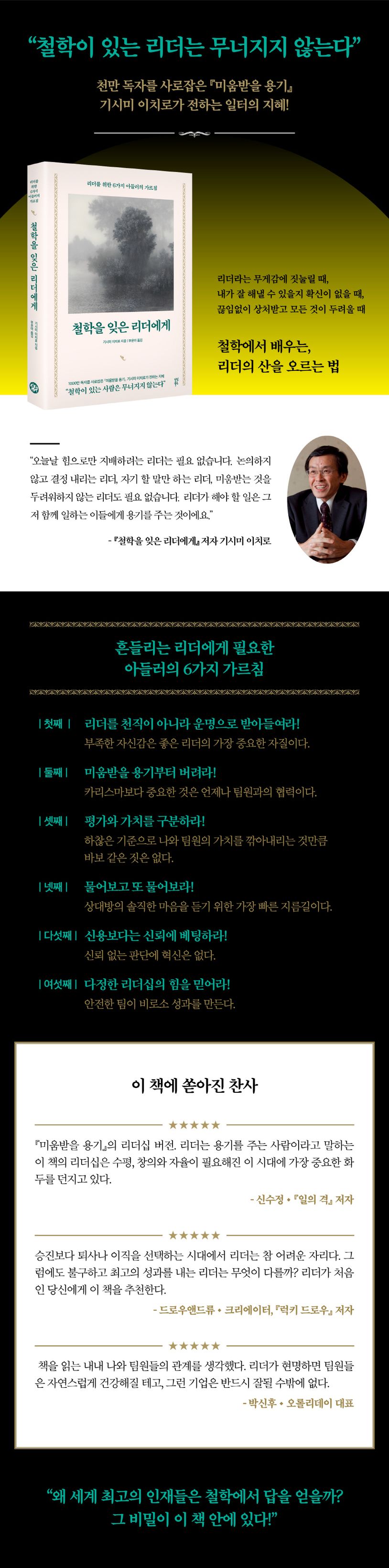 신간 「철학을 잊은 리더에게」에서는 인간은 불완전한 존재이며, 끊임없이 변화하고 발전할 수 있다고 여기는 ‘심리학의 3대 거장’ 알프레드 아들러(Alfred Adler)의 철학을 기반으로 리더십의 방향성을 구체적이고 명확하게 제시한다. 1부는 고뇌하는 리더가 철학자 기시미 이치로에게 상담받는 내용으로 어려움에 맞설 용기를 전해준다. 2부에서는 실제로 세계적 기업을 이끄는 리더들과의 대담을 담아 앞서 언급한 리더론을 실제 현장에서 적용한 예를 소개한다.