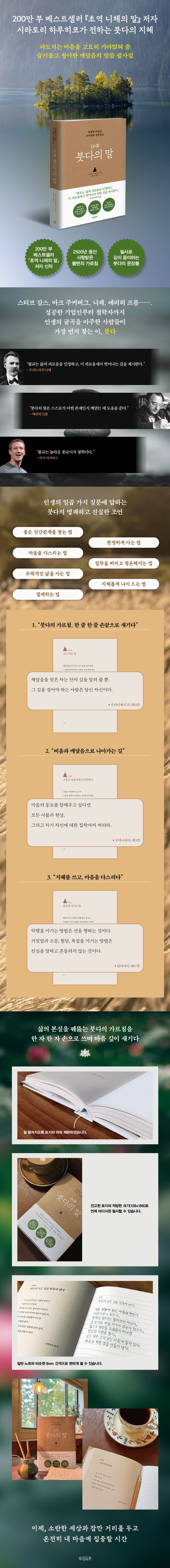 또한 본문을 필사할 수 있는 노트에 눈으로만 읽었던 가르침을 손으로 직접 쓰며 다시 한번 곱씹을 수 있다. “지식은 가르칠 수 있어도, 지혜는 가르칠 수 없다”는 붓다의 말처럼, 행동 없이는 아무리 현명한 말도 공허한 훈계에 머무를 수밖에 없다. 그런 의미에서 정갈한 말씀을 찬찬히 적어 내려가는 행위인 필사는 일상에서 가장 쉽게 행할 수 있는 마음 수양이다. 빈 종이 위에 한 자 한 자 붓다의 말을 따라 적다 보면, 독자들의 마음에도 자신만의 지혜가 천천히 채워지기 시작할 것이다.