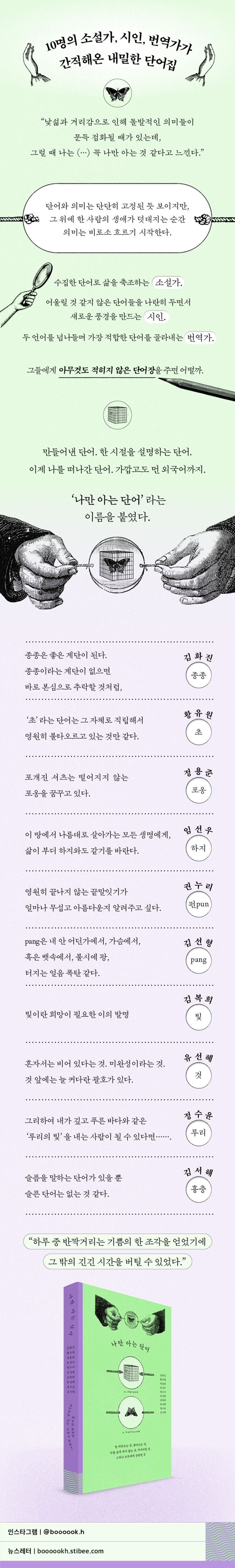 만들어낸 단어. 한 시절을 설명하는 단어. 이제 나를 떠나간 단어. 가깝고도 먼 외국어까지. 《나만 아는 단어》는 10명의 소설가, 시인, 번역가가 아껴두었던 ‘나만 아는 단어’에 대해 쓴 책으로 ‘휴머니스트 세계문학’(흄세)에서 최초로 선보이는 국내 작가 앤솔러지다. 우리는 모두 단어와 함께 살아가지만 더욱 가까이 있는 사람들이 있다. 수집한 단어로 삶을 축조하는 소설가. 어울릴 것 같지 않은 단어들을 나란히 두면서 새로운 풍경을 만드는 시인. 두 언어를 넘나들며 가장 적합한 단어를 골라내는 번역가까지. 그들에게 아무것도 적혀 있지 않은 단어장을 주면 어떨까? 이 책은 10명의 소설가, 시인, 번역가가 각각 다섯 단어씩, 전체 오십 단어를 소개하는 ‘단어집’이지만 이미 등재된 의미를 매만지거나 새로운 용례를 제안하지 않는다. 작가들은 자신의 삶을 렌즈 삼아 완전히 밀착하지 못하는 단어와 의미 사이를 들여다본다.