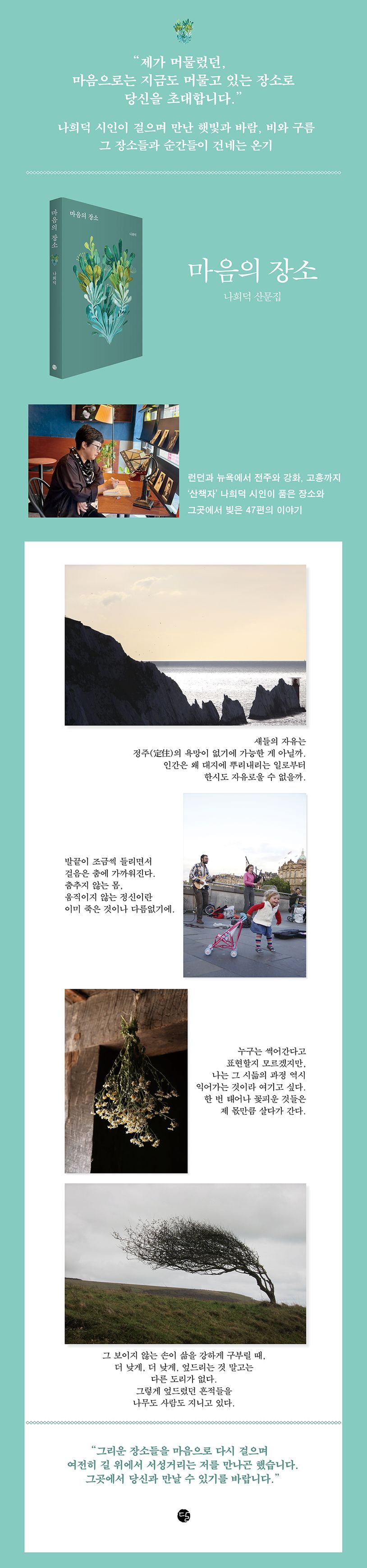 모두에게 그러한 장소가 있음을 잊지 않도록, 시인 자신이 “머물렀고, 지금도 마음으로 머무르고 있는 장소들”에 독자를 초대하는 산문집 『마음의 장소』는, 언젠가 지치고 외로울 때 오랜 친구처럼 다시 찾게 될 한 권의 장소가 되어줄 것이다.