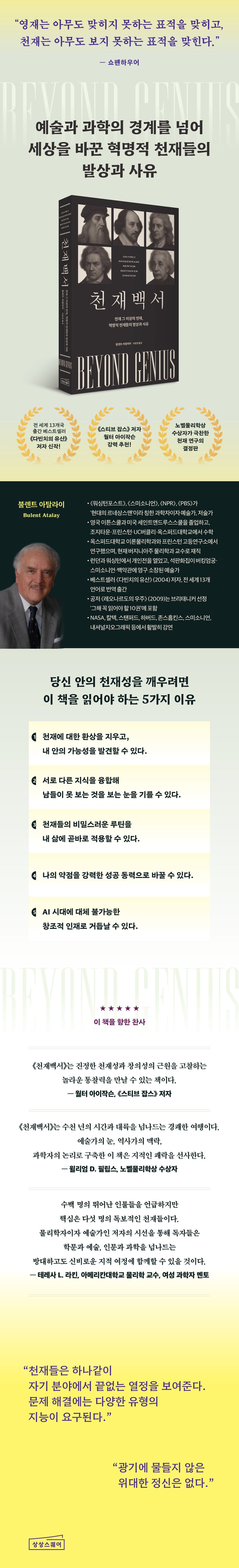 물론 ⟪천재백서⟫는 ‘차세대 아인슈타인’이나 ‘제2의 다빈치’가 되는 방법을 전하는 책은 아니다. 그러나 아탈라이의 혁신적인 천재 연구는 인류 역사상 가장 창조적인 사상가와 창작자들을 바라보는 전혀 새로운 렌즈를 제공한다. 그 여정을 따라가다 보면 우리 역시 삶을 고취할 다양한 영감을 건져 올리게 된다.