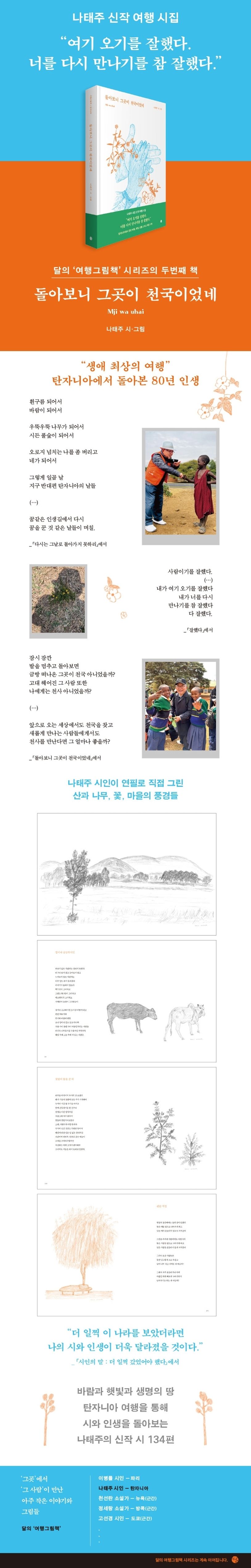 ‘풀꽃 시인’ 나태주 신작 여행 시집 『돌아보니 그곳이 천국이었네』는 달에서 선보이는 여행그림책 시리즈의 두번째 책이다. 80세의 노시인은 6년간 후원해온 “눈이 크고 맑고 얼굴이 둥근” 어린 소녀를 만나기 위해 꼬박 하루를 날아가 탄자니아에 도착했다. 시인에게는 “생애 최상의 여행”이었던 붉은 먼지와 바람과 햇빛이 가득한 생명의 나라에서 일곱 날을 보내고 돌아와, 다시 돌이켜본 삶의 장면들을 신작 시 134편과 시인이 직접 그린 연필화 62점과 함께 담아내고 있다.