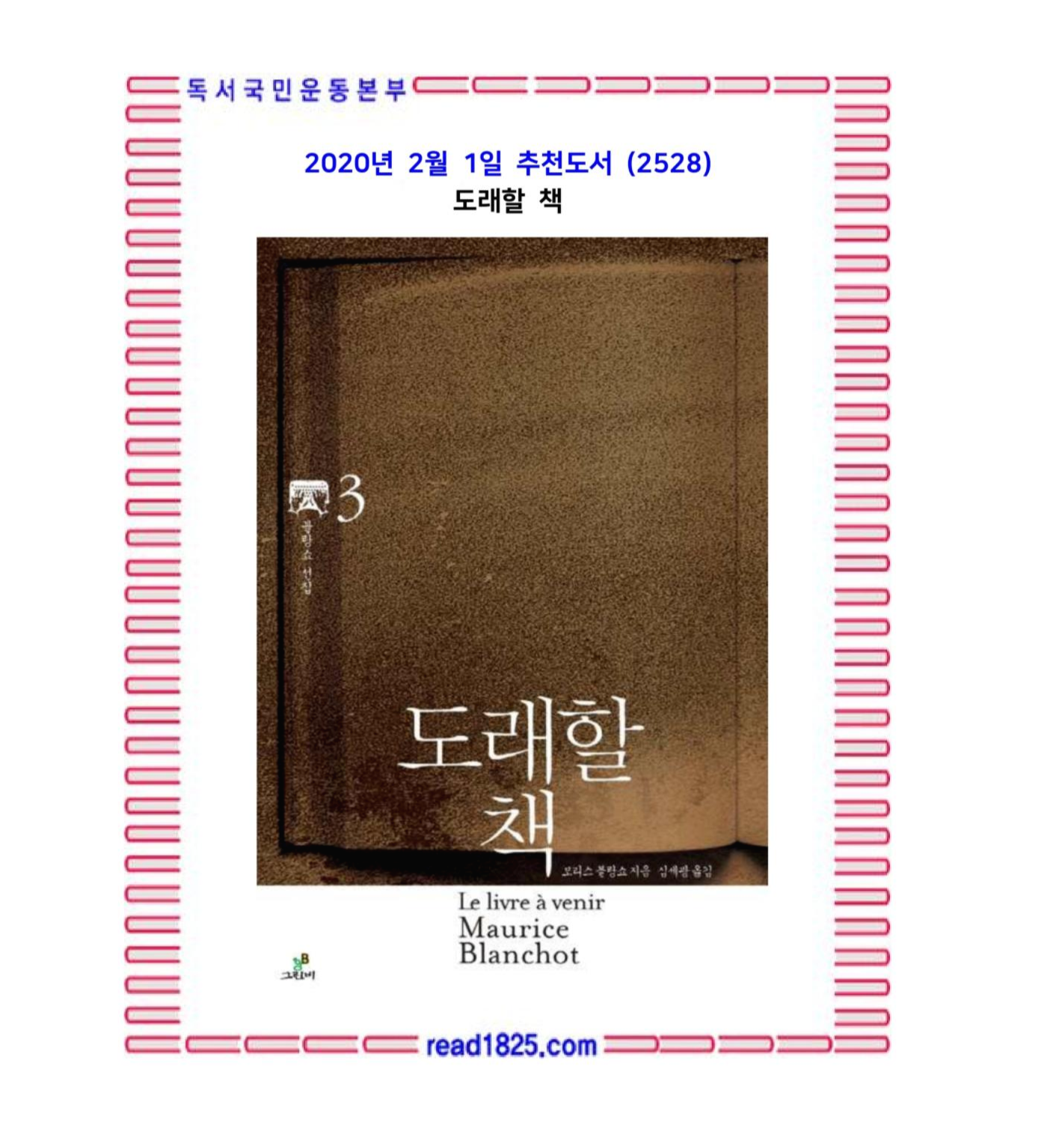 ‘바깥의 사유’라는 독특한 개념으로 오늘날 현대철학에 새로운 지적 영감의 원천을 제공해 왔으며, 많은 작가와 독자, 비평가들에게 끊임없이 문학에 대한 깊은 통찰을 선사하는 모리스 블랑쇼. 20세기 이후 서구 문학에 대해 가장 탁월한 분석이라고 평가받는 그의 역작 『도래할 책』이 그린비 블랑쇼선집 다섯번째로 출간되었다(선집 권차로는 3권). 블랑쇼는 이미 1955년에 『문학의 공간』(그린비 블랑쇼선집 2권)에서 우리에게 문학이 무엇인지, 문학이 과연 가능한지 근본적인 질문을 던진 바 있다. 그로부터 4년 후 출간된 『도래할 책』은 『문학의 공간』에서 소묘되었던 글쓰기, 작가, 작품, 독서 등과 같은 그의 개념들을 더욱 철학적이고 근본적인 수준으로 다룬다. 또한 『도래할 책』에서는 마르셀 프루스트부터 독일 작가 헤르만 브로흐에 이르기까지 다양한 작가들의 작품을 아우르며, 그들 작품과 자신의 문학에 대한 사유를 자연스럽게 조화시키고 있다.