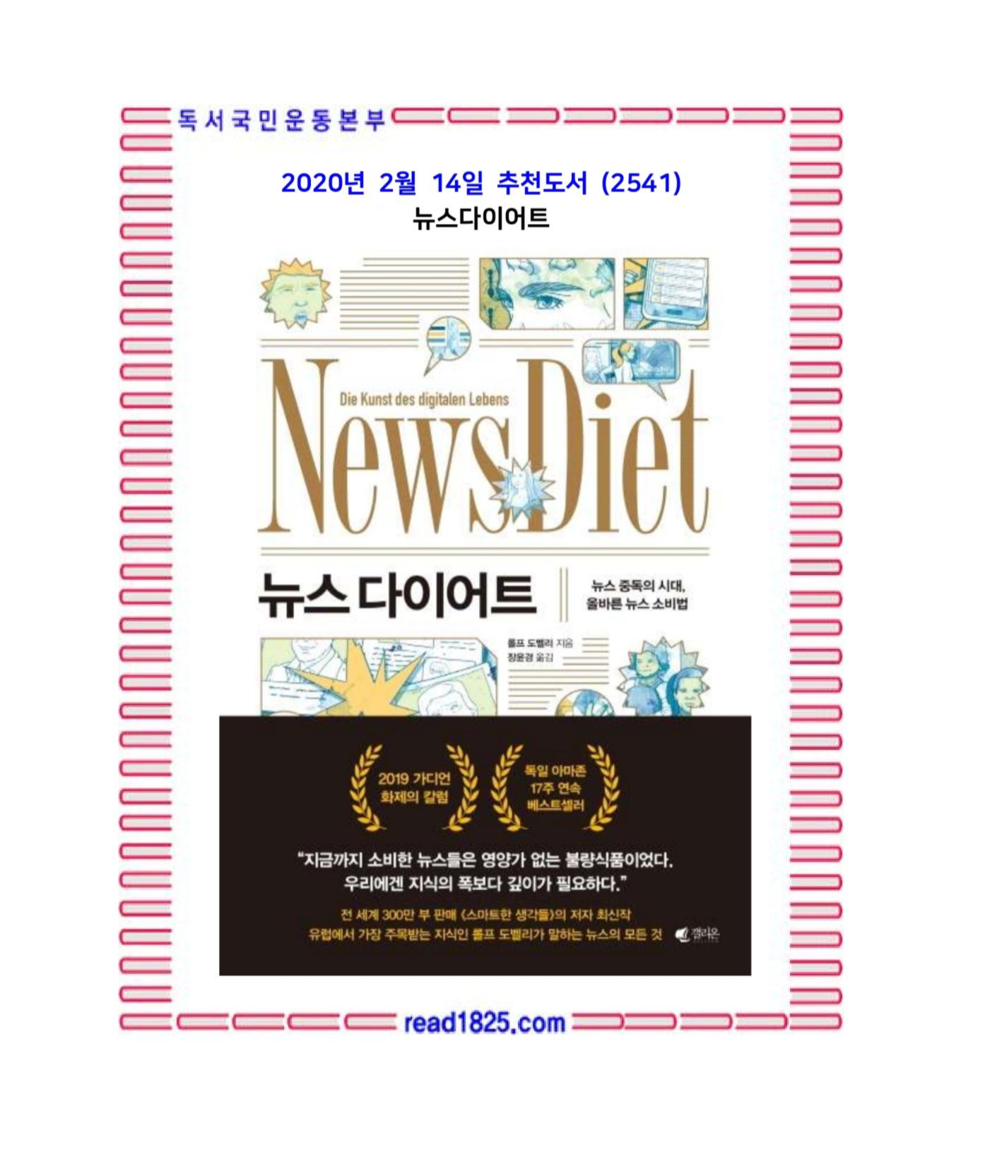 지난 열두 달 동안 당신은 대략 2만 개에 달하는 짧은 뉴스들을 먹어치웠을 것이다. 그럼 적게 잡아도 하루에 약 60개의 뉴스 보도를 삼킨 셈이다. 우리 한번 솔직하게 말해보자. 그 뉴스들 가운데 당신의 인생, 가족, 사업, 경력, 그리고 몸과 마음의 건강에 보다 유익한 결정을 내리게 도와준 뉴스가 있다면 하나만 꼽아보자. 그 뉴스가 아니었더라면 결코 내릴 수 없었을, 일생일대의 중대한 결정이 하나라도 있는가? - 당신과 무관한 2만 개의 뉴스