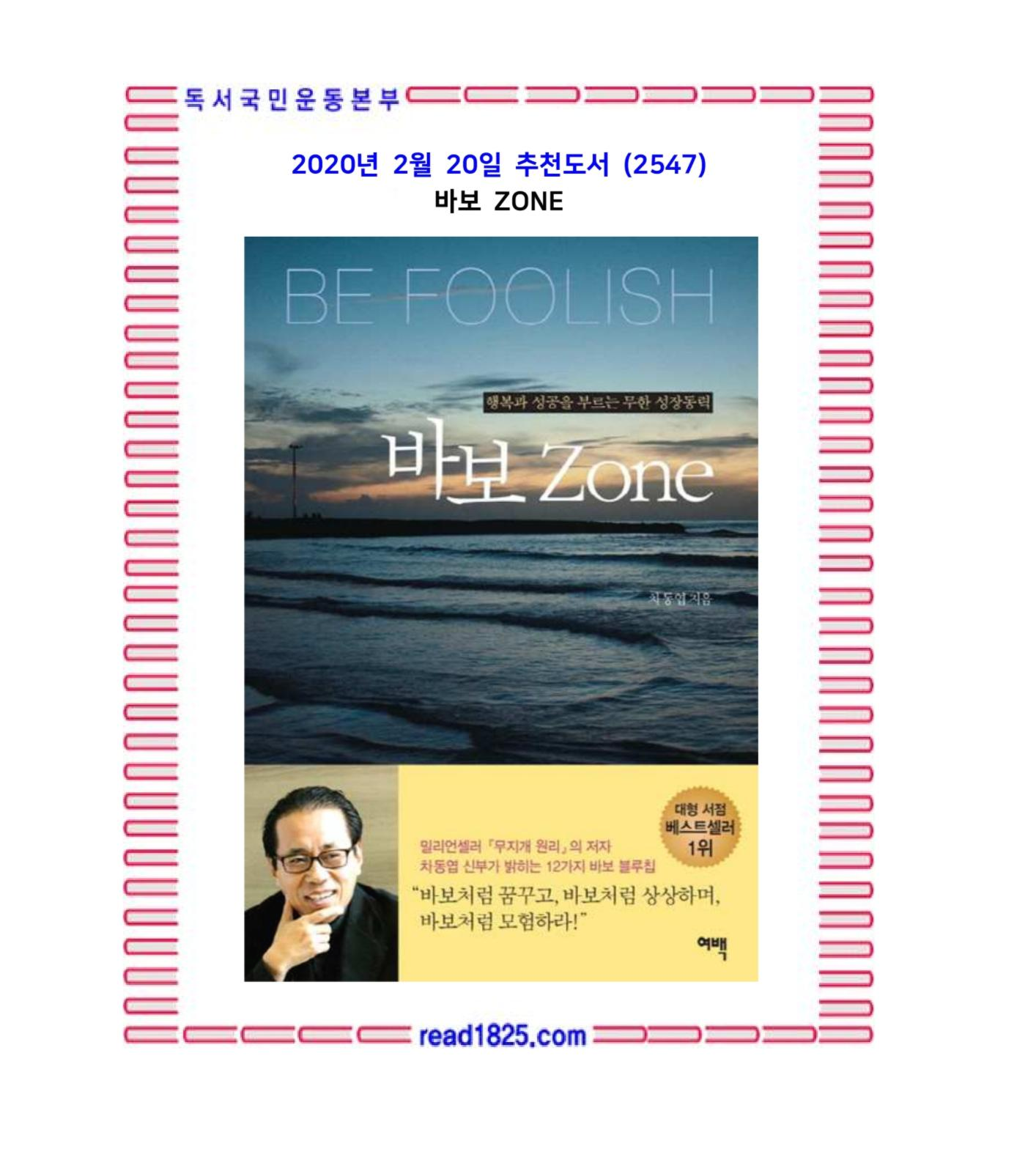 이처럼 세계가 ‘바보’에 주목하고 있다. 아니, ‘바보’가 가진 가능성에 주목하고 있다. 『무지개 원리』로 한국형 자기계발서의 신기원을 이룬 차동엽 신부는 새 책 『바보존(zone)』을 통해 새로운 세상을 이끌 시대의 화두로서 ‘바보’에 주목하고, 바보 안에 숨겨진 무한 성장동력과 그 에너지를 깨울 방법을 전하고 있다.