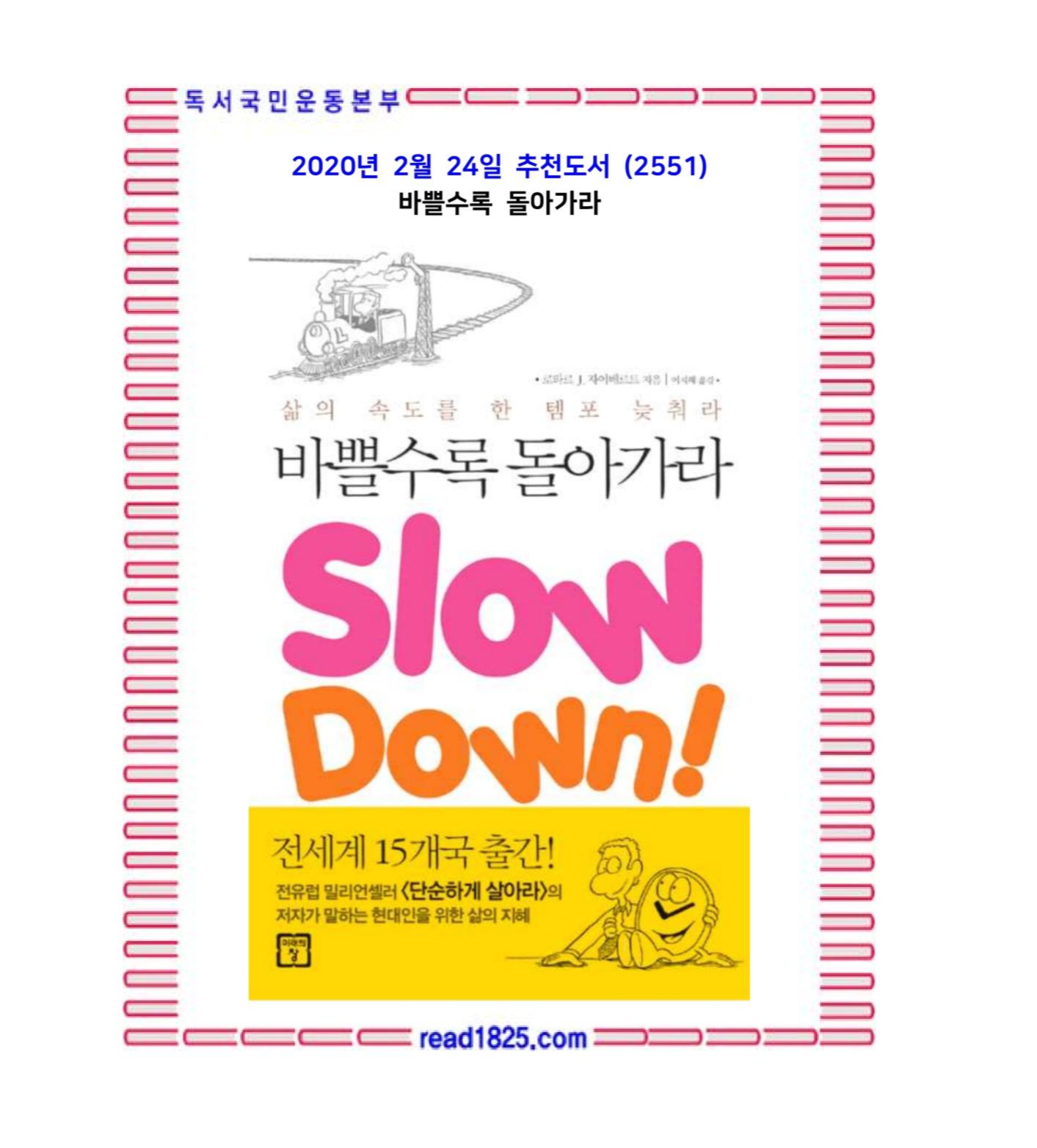 주변에서 일 좀 한다는 사람들에게서 이런 비명을 자주 듣지 않았는가? 특히 세상 모든 일들을 혼자 짊어진 듯 빨리 끝내야 한다며 자신과 주변 사람을 채근하는 사람들을 심심치 않게 보았을 것이다. 하지만 빠르게 성장하려고만 한 탓에 우리는 많은 것을 놓치고 말았다. 대부분의 우리나라 사람들은 어려웠던 시절을 겪은 기억에 너도나도 잘 살아보자며 어른, 아이 할 것 없이 밤낮으로 일하고 공부하느라 여가시간을 제대로 쓰는 방법을 모른다. 그래서 주말이면 그저 집에서 잠자기에 바쁘다. 또 가족끼리 집에서 마주보는 일이 줄어들면서 가족간의 정을 나눌 수 있는 대화를 나누는 시간도 대폭 줄었다. 가장 큰 문제는 자신이 왜 이렇게 열심히 일을 해야 하는지에 대한 목표의식을 잃은 것이다. 능동적이고 뚜렷한 목표의식 없이 일을 하다 보니 무엇이든 대충대충 하게 되었고, 그런 의식 속에서 나온 ‘빨리빨리’문화는 과정이야 어떻든 기한에만 맞추면 된다는 ‘적당주의’로 이어지게 되었다. 과연 무엇이 문제이고 해결방법은 무엇일까? 이러한 일, 건강, 가족, 가치관 등의 문제들을 해결할 수 있는 근본적인 방법은 무엇일까?