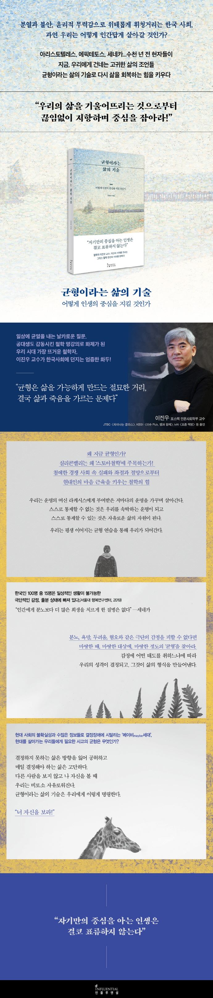 인터넷의 수많은 가짜뉴스와 각종 음모론은 개인의 신념을 현혹하고, SNS와 TV 방송에 도배된 셀럽들의 사치스러운 일상은 우리의 자존감을 무너뜨린다. 눈코 뜰 새 없는 일상에 지쳐 돌아와 가학적 먹방이나 사생활 폭로 콘텐츠를 탐닉하다 보면 윤리적 무력감에 빠져 문득 이런 의문이 든다. “과연 우리는 무엇을 위해 살고 있는 것인가?” 이에 각종 매체와 대중강연, 칼럼을 통해 ‘의심의 철학’이라는 철학의 시대정신을 강조해온 이진우 교수는 2500년 전 ‘산다는 것’이 ‘철학한다’는 것과 동의어였던 그리스 시대 철학의 정원으로 돌아가, 위태롭게 흔들리는 개인과 사회에 ‘균형’이라는 화두를 제시한다. 그는 신간 《균형이라는 삶의 기술》에서 아리스토텔레스의 중용 철학에서 시작해 세네카, 에픽테토스로 이어지는 스토아 철학의 잠언들을 바탕으로, 이성과 감정, 이기주의와 이타주의, 풍요와 빈곤, 진보와 보수 등 우리를 둘러싼 극단이 무엇인지 살펴본다. 나아가 감정과 사고와 일상의 중심을 찾는 균형 연습을 통해 흔들려도 결코 무너지지 않는 유연한 삶의 지혜를 제시하고 있다.
