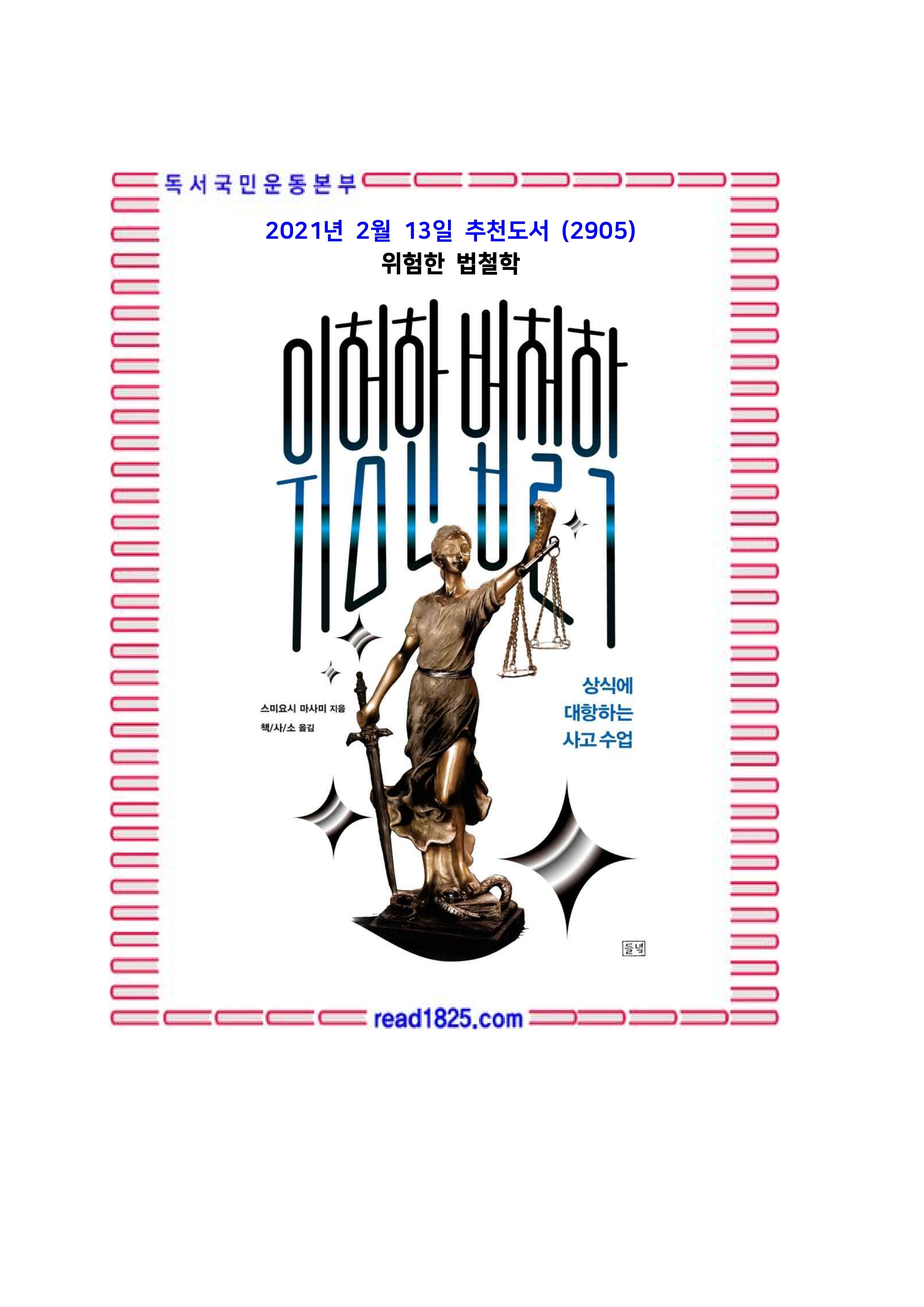 이 책은 악마의 얼굴을 한 법철학 쪽이다. 굳이 법률과 그것을 지지하는 학(學)이나 상식에 의문을 보이며 어깃장을 놓는다. 법률은 결국 세계를 돌아가게 하는 시스템들 중 하나에 불과하다. 이처럼 법률을 상대화함으로써 법률에는 맡길 수 없는 인간의 다양한 ‘살아가는 힘’을 깨닫게 한다. 룰에 따르는 것이 아니라 자기 자신의 머리로 생각함으로써 우리는 더욱 자유로워진다. 우리가 인지하지 못한 채로 오염된 상식과 저열한 권위에 휘둘리고 있지 않은지 스스로를 의심해봄으로써 비판적 안목과 주체적 사고를 함양하도록 도와주는 책이다. 일본 아오야마가쿠인(?山?院) 대학의 초인기 강의를 기반으로, ‘정의’ ‘권리와 의무’ ‘자유’ ‘평등’ 등 크게 열한 가지 장으로 분류하고, 매우 유머러스한 필체로, 때로는 지독한(그러나 실제로 있었던) 에피소드를 제시하면서 흥미진진한 법철학 세계로 독자를 안내한다.
