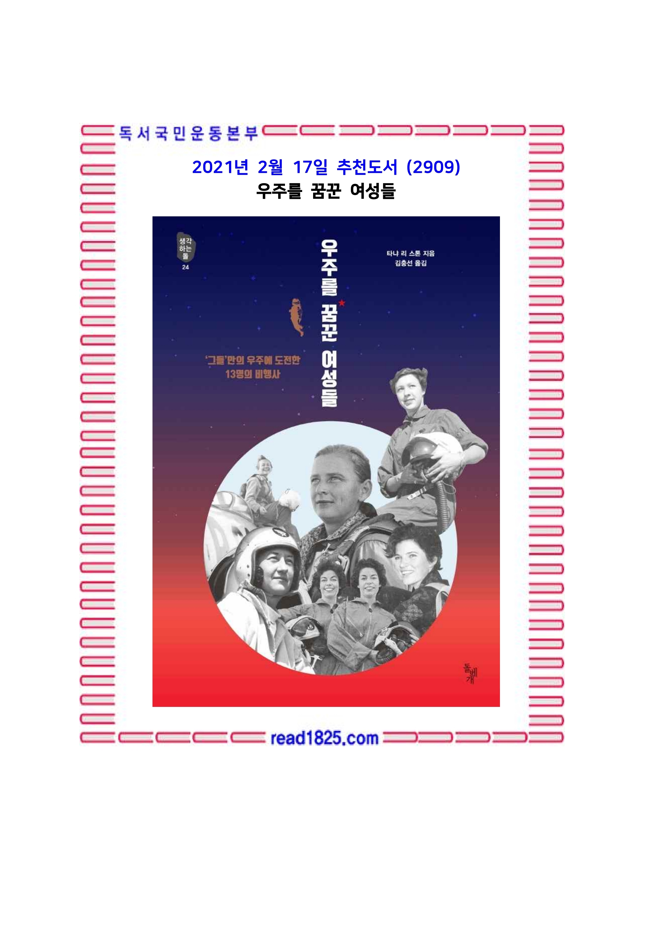 이 여성들이 우주 비행사에 도전한 때가 1961년이었다. 여성은 남성의 서명 없이는 차를 빌릴 수도, 은행에서 대출을 받을 수도 없던 시절이었다. 여자 프로스포츠 팀은 하나도 없었다. 여자는 텔레비전에서 뉴스를 전달하는 기자도 될 수 없었고, 마라톤 대회에 참가하거나 경찰관으로 일하는 것도 허용되지 않던 시절이었다. 그리고 제트기 조종사가 되는 것도 불가능했다. 당시 여자라서 할 수 없었던 수많은 일 중 단 몇 가지만 소개해도 이 정도였다. 상황이 이랬지만 이 여성들은 우주 비행사가 되려는 노력을 포기하지 않았다. 이들의 결심은 매우 굳건했다. 이들 모두가 어릴 때부터 같은 꿈을 품었다. 이 여성들은 비행할 운명을 타고났던 것이다. - 18쪽