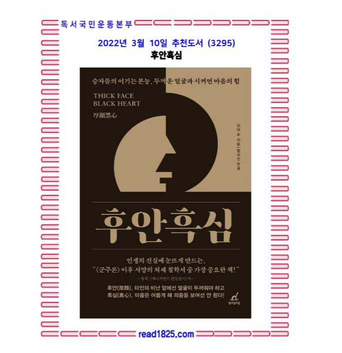 저자는 후흑의 정신이야말로 ‘이 교활하고, 뻔뻔하고, 음흉하며, 잔인하기까지 한 세상에서 나를 지켜내고 내 뜻을 이루는 창과 방패’라고 역설한다. 역사상 절대 용서할 수 없을 것 같은 악한과 이 세상을 천국처럼 만들었던 위대한 성인의 유일한 공통점이 바로 ‘후흑’이라고 저자는 말한다. 말 그대로 잘 벼려진 칼처럼 내 뜻을 실현시켜 줄 유일한 무기가 바로 ‘후흑’이라는 것이다. 대부분의 악인들은 양심과 연민이 결여된 저급한 수준의 후흑을 마구 휘두른다. 그래서 ‘어떻게 저런 사람들만 성공하는 거야’라는 탄식이 나오는 것이다. 그렇기에 우리가 그런 이들에게 휘둘리지 않고 자신의 선한 의지를 인생에서 실현하기 위해서는 더 고매한 후흑으로 스스로를 무장해야만 한다고 책은 말한다.