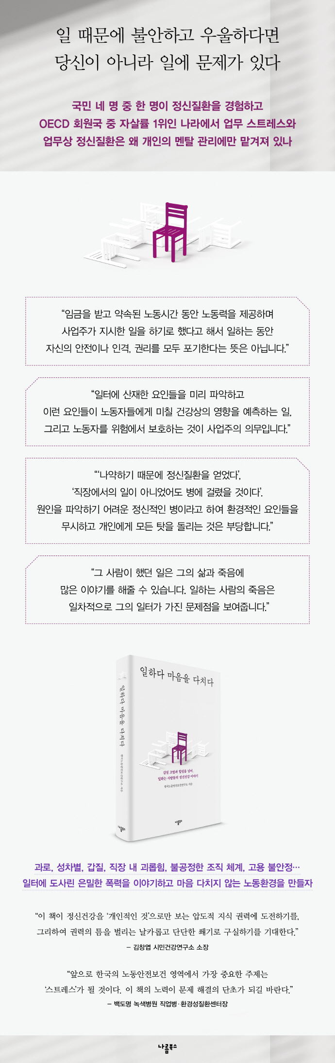 일터에서 발생하는 스트레스와 노동자 정신건강 문제를 분석하고 해결 방안을 모색한다. 업무상 정신질환과 산업재해를 추적, 연구해온 의료, 법률, 노동 전문가들이 극단적 사례나 질병과 치료에 집중됐던 그간의 방식에서 벗어나 원인과 일터에 주목해 구체적이고 쉬운 말로 노동자 정신건강을 다뤘다. 직무 스트레스의 모형과 정신질환에 대한 이해, 자살 통계 분석, 정신질환과 자살의 산업재해 보상 절차, 직장 내 정신건강 증진 활동 방안 등을 서술했다. 결국 노동자 정신건강은 일하기 좋은 일터를 만드는 데 달려 있다는 결론으로 나아간다.