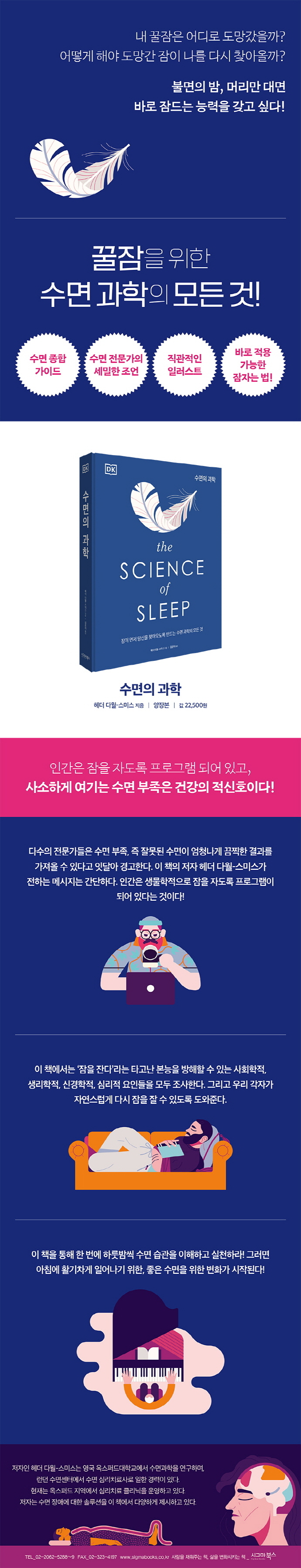 『수면의 과학』은 잠, 즉 ‘수면’이라는 주제를 더욱 정확하게 이해하고자 하는 사람들을 위한 길잡이다. 그래서 우선 수면을 둘러싼 오해와 헛소문과 말도 안 되는 속설들을 걸러낼 것이다. 수면에 대한 잘못된 지식은 결국 무시무시한 ‘불면’의 늪으로 빠뜨리기 때문이다. 또한 수면의 과학적 원리와 제대로 잠을 자기 위해 필요한 지식을 이해하기 쉬운 그림으로 제시한다. 잠이 무엇보다 소중한 사람들을 위해 수면 루틴과 수면 위생법, 수면 일기 같은 자잘한 팁도 챙겨준다.
