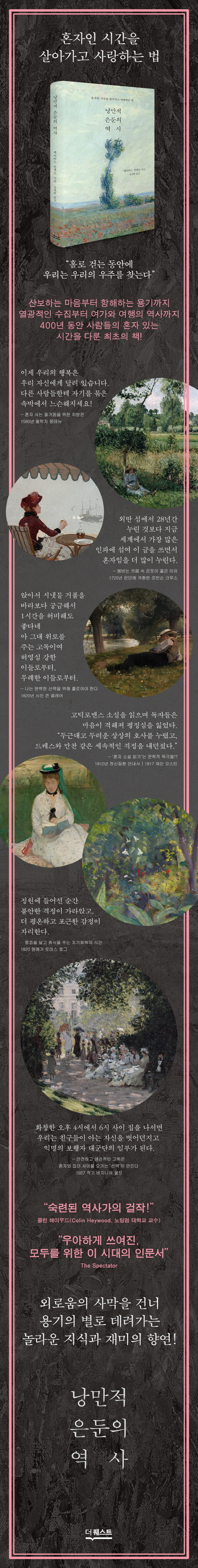 이 책을 읽는 동안 독자에겐 혼자 있는 시간의 의미가 전혀 새롭게 다가올 것이다. 『낭만적 은둔의 역사』는 외로움과 고독을 잘 구분하여 홀로인 시간을 건강하게 보낼 용기를 보탠다. 역사, 사회경제, 심리, 종교, 문화를 종횡무진하는 모험을 함께하며 풍성한 교양과 귀한 재미를 느끼길 바란다.
