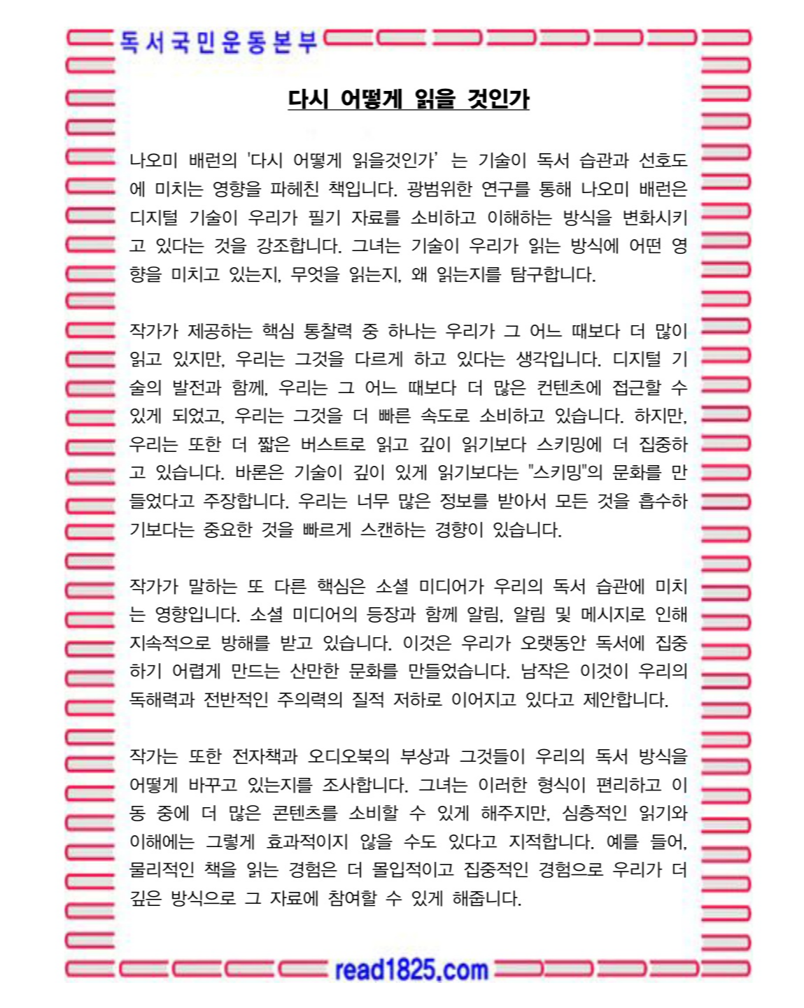 나오미 배런의 '다시 어떻게 읽을것인가’는 기술이 독서 습관과 선호도에 미치는 영향을 파헤친 책입니다. 광범위한 연구를 통해 나오미 배런은 디지털 기술이 우리가 필기 자료를 소비하고 이해하는 방식을 변화시키고 있다는 것을 강조합니다. 그녀는 기술이 우리가 읽는 방식에 어떤 영향을 미치고 있는지, 무엇을 읽는지, 왜 읽는지를 탐구합니다.