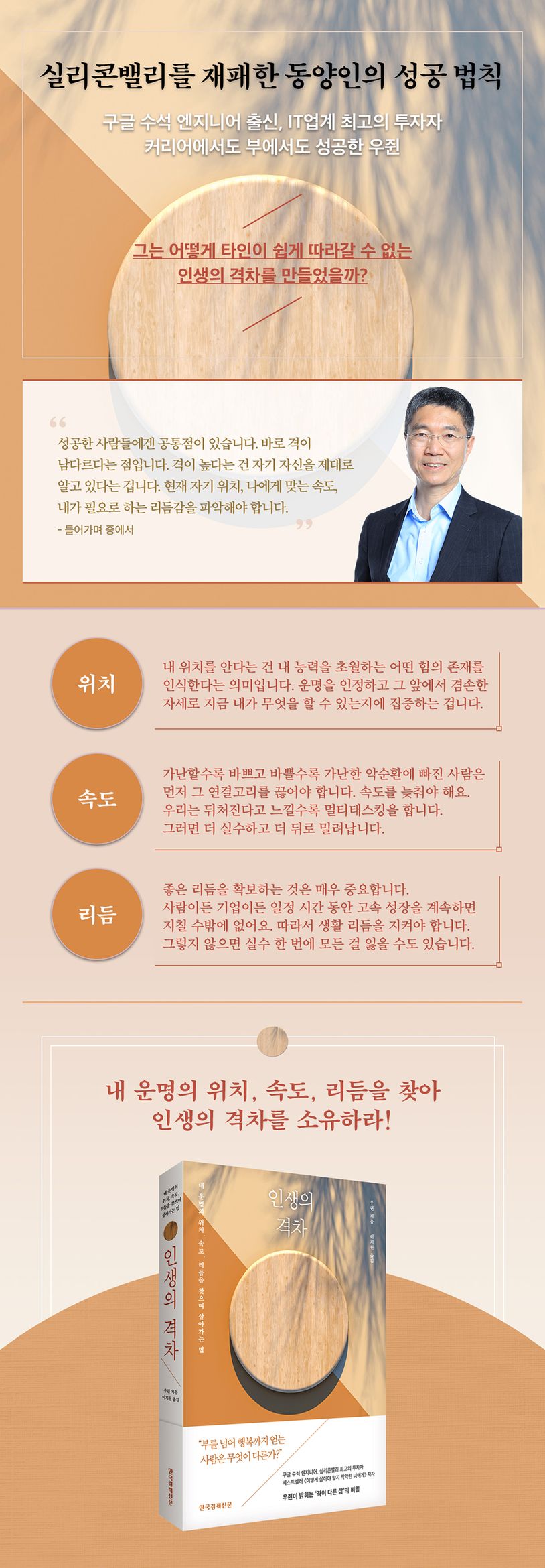 커리어, 부, 가정생활 등 거의 모든 영역에서 성공적인 삶을 소유한 우쥔은 이번 책에서 자신의 인생 철학을 풀어놓는다. 이를 관통하는 키워드는 ‘격’이다. 그가 관찰한 결과 성공한 사람들은 모두 격이 높았다. 첫째, 성공한 사람들은 철저히 현실적이다. 자신의 현재 ‘위치’를 냉정하게 판단한 후 원하는 목표를 향해 나아가며, 그 과정에서 현실적으로 자기에게 맞는 ‘속도’와 ‘리듬’을 찾는다. 그러나 의외로 많은 사람들이 이러한 현실 감각을 갖추지 못한 채 살아간다. 둘째, 성공한 사람들은 최대한 적은 일을 한다. 많은 일을 하려 하지 않고 의미 없는 일을 더더욱 하지 않으며, 영향력이 큰 몇 가지 일을 하는 데 집중한다. 그러나 사람들 대부분은 이와 반대로 행동한다.