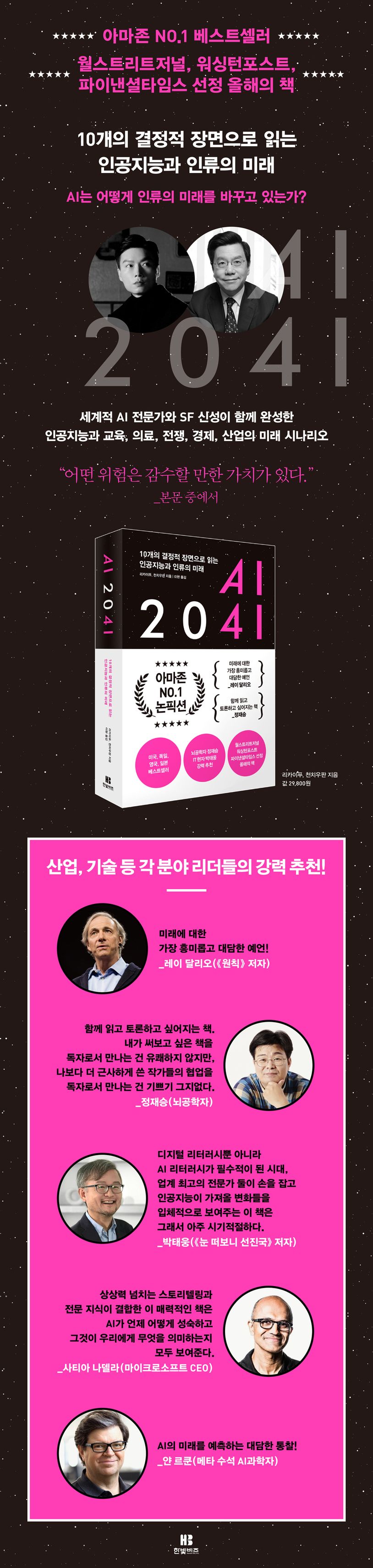 《AI 2041》의 저자이자 마이크로소프트와 구글, 애플에서 인공지능 연구와 제품 개발에 참여한 리카이푸와 데뷔작부터 열풍을 불러일으킨 SF 작가 천치우판은 인공지능의 발전에 관한 여러 측면을 면밀하게 살펴보고 주의를 기울이되, 동시에 그 기술이 가진 잠재력과 큰 그림을 보는 것이 중요하다고 말한다. 그래야 인공지능과 인류의 미래에 관한 온갖 걱정과 우려들 사이에서 균형을 잡을 수 있기 때문이다. 한국, 일본, 인도 등 세계 곳곳을 배경으로 한 흥미진진한 SF소설 10편과 AI 전문가의 날카로운 기술분석이 더해진 이 책은 그래서 우리가 곧 맞이하게 될 가까운 미래에 대한 가장 정확한 예언이자 시나리오가 되어준다.