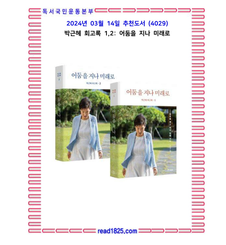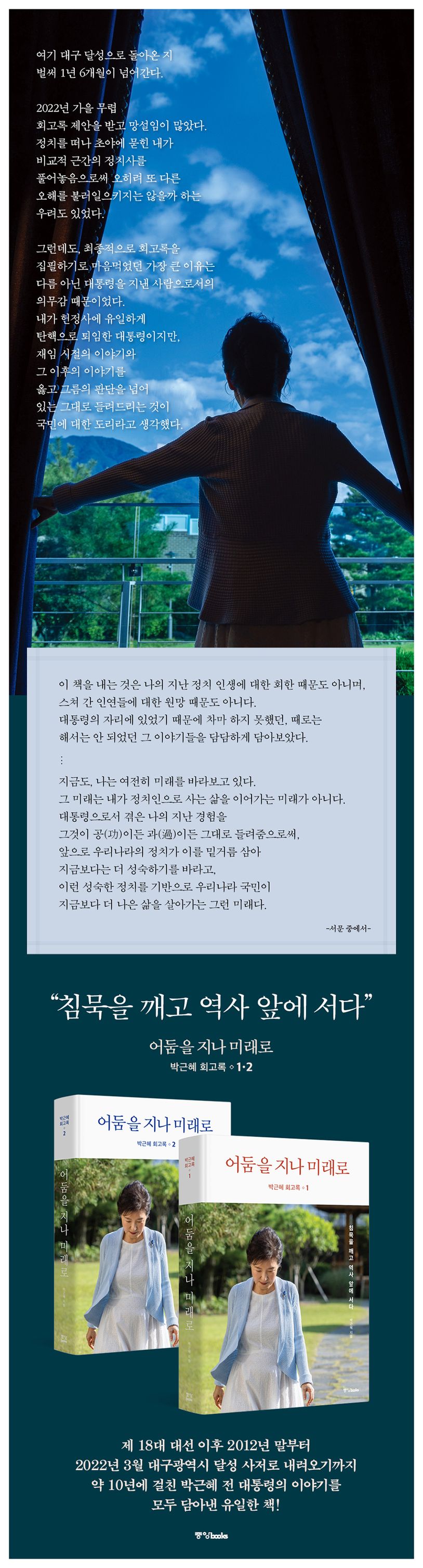 박근혜 전 대통령의 정치 일대기를 담은 도서, 《박근혜 회고록: 어둠을 지나 미래로 1ㆍ2》 총 2권이 2024년 새해를 맞이해 출간됐다. 본 도서는 박근혜 전 대통령의 1998년 정계 입문 시기부터 대통령 당선 후 펼친 외교안보와 국내 다양한 정책 및 2017년 탄핵과 특별 사면에 이르기까지 박근혜 대통령의 정치 역사를 모두 살펴볼 수 있는 책으로, 역사적 사료로서의 가치도 높다.