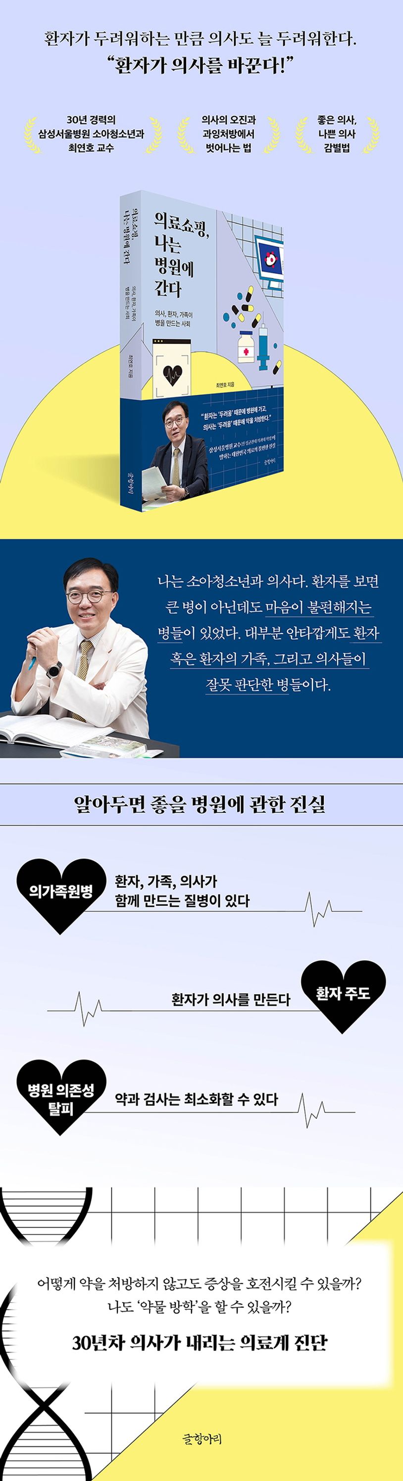 삼성서울병원에서 25년간 진료하고 있는 저자는 이 책에서 의사-환자-가족의 트라이앵글이 어떻게 없던 병까지도 만들어내는지를 밝힌다. 의학 지식만으로 환자를 보는 의사, 매우 걱정이 많은 환자, 그리고 자신의 두려움을 피하려고 환자를 컨트롤하는 가족 사이에 벌어지는 악순환은 종류별로 다양하다. 또한 저자는 과잉된 병원쇼핑의 세태와 ‘발병發病하는 사회’의 실상을 의료 현장에서 짚어낸다. 물론 이 책은 병원과 의료시스템에 대해 잘 모르는 이들을 위해 좋은 의사 감별법도 알려준다. 또한 환자 입장에서 고려한 ‘약물 방학’이란 개념도 있어 약물 중단을 시도하고 성공했던 사례들을 보여준다. 그럼으로써 저자가 강조하는 것은 ‘사람이 중심이 되는 병원’, 즉 휴머니즘 의료다.