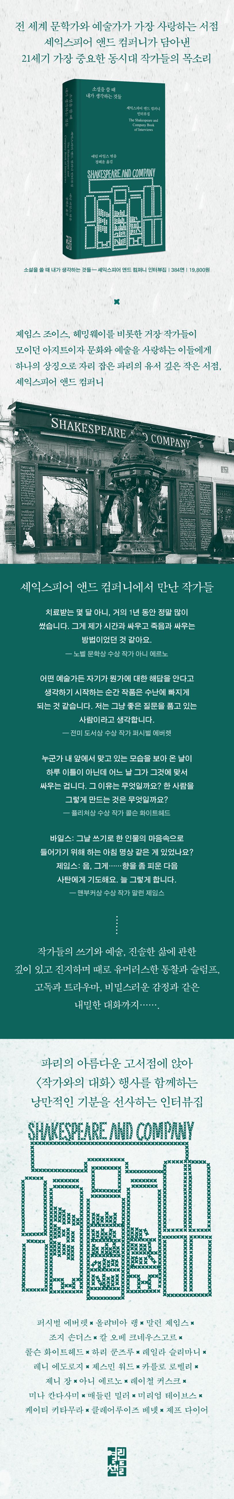 제임스 조이스, 어니스트 헤밍웨이, 에즈라 파운드, 앙드레 지드, 폴 발레리 등 당대 거장 작가들이 모여들었던 주요한 장소이자 문학과 예술을 사랑하는 이들에게 문화적인 상징으로 자리 잡은 파리의 서점 〈셰익스피어 앤드 컴퍼니〉. 『소설을 쓸 때 내가 생각하는 것들』은 2012년부터 2022년까지 바로 그 셰익스피어 앤드 컴퍼니에서 10년간 진행되었던 작가와의 대화 중 최고의 인터뷰를 엄선한 대담집이다. 노벨 문학상 수상 작가 아니 에르노, 퓰리처상 수상 작가 콜슨 화이트헤드, 공쿠르상 수상 작가 레일라 슬리마니, 전미 도서상 수상 작가 제스민 워드, 맨부커상 수상 작가 말런 제임스 등 평단의 찬사와 대중의 주목을 한 몸에 받는 소설가부터 제니 장, 클레어루이즈 베넷 등 오늘날 촉망받는 신진 작가까지, 21세기 가장 중요한 작가들의 생생한 목소리를 담았다. 여기에 카를로 로벨리, 제프 다이어, 올리비아 랭 등 논픽션을 다루는 작가들이 포함되어 이야기의 풍성함을 더한다. 책과 문학, 쓰기와 예술, 진솔한 삶에 관한 깊이 있고 진지하며, 때로 유머러스하기까지 한 생기 넘치는 대담들은 페미니즘, 인종 차별, 계급 및 정체성과 같은 동시대 주요 담론에 관한 빛나는 통찰을 엿볼 수 있다. 책, 그리고 책과 연결된 공간을 사랑하는 독자들에게 마치 파리의 아름다운 고서점에 자리해 〈작가와의 대화〉 행사를 함께하는 낭만적인 기분을 선사하는 작품.